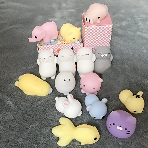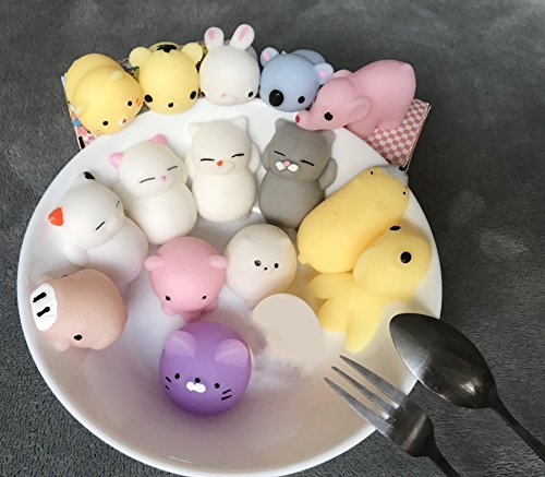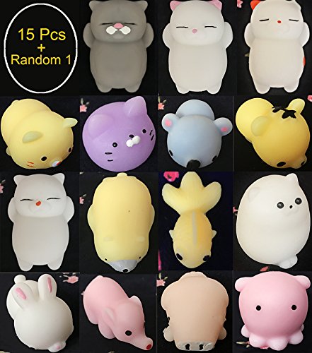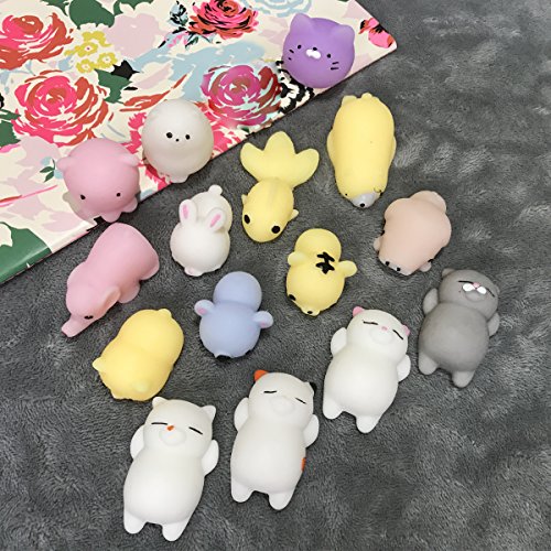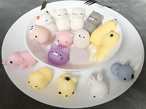 - ❤PACKAGE INCLUDE: 15 different animal+random squishy toy showed on the picture(blue bear, white lazy cat, orange spotted lazy cat, gray lazy cat, pink dot lazy cat, white rabbit, pink octopus, yellow Tiger, purple dumplings cat, yellow goldfish,dingding,yellow cat, pink pig, pink elephant,white Totoro,yellow polar bear).
