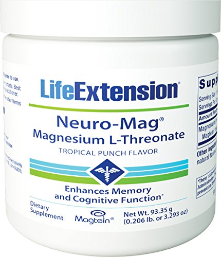 Life Extension Neuro-Mag® Magnesium L-Threonate Powder, Tropical Punch Flavor, 93.35 g (0.206 lb. or 3.293 oz). Pack of 1. Neuro-Mag® Magnesium L-Threonate supports healthy memory and cognition by optimizing magnesium levels in the brain. Magnesium is essential for over 300 different biochemical reactions in the body - from cardiovascular and bone health support to energy metabolism, mood, and most especially cognitive function. Unfortunately, it's hard to maintain optimal levels of magnesium in the brain. And that's a problem since magnesium deficiency increases with normal aging. But because of its superior absorption into the bloodstream and nervous system, Neuro-Mag® provides the ideal form of magnesium for enhanced memory and cognitive function. Serving Size 1 scoop (approx. 3.11 g). Servings Per Container about 30.Feature