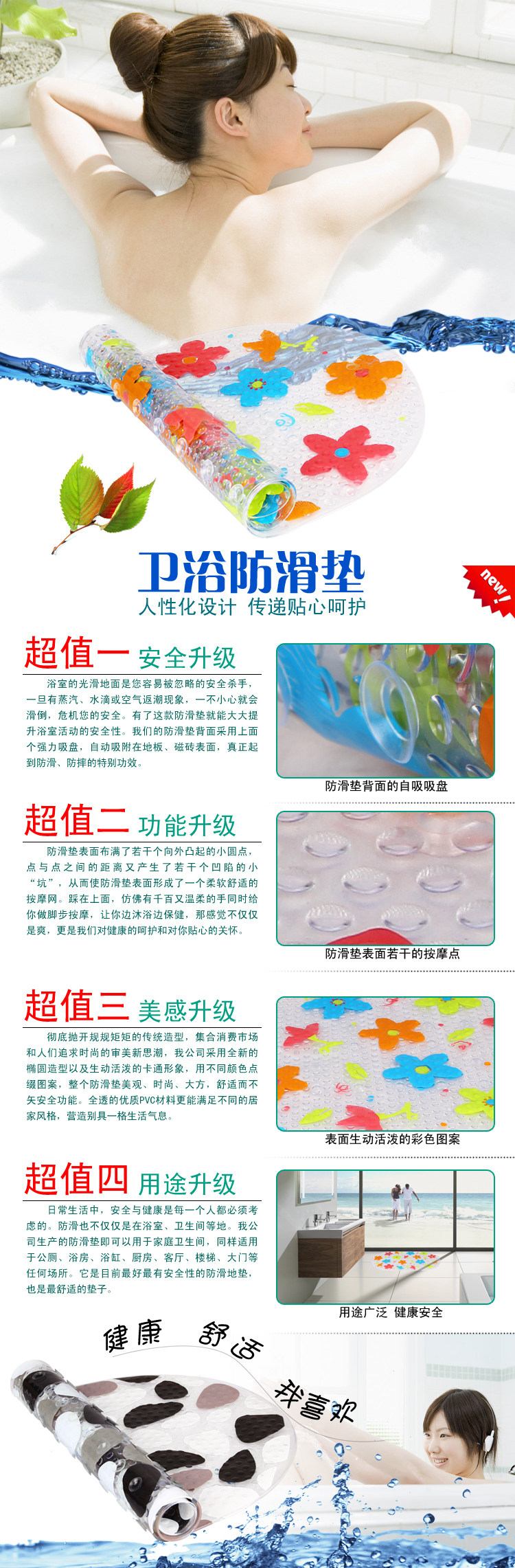 [Cleaning and durability]: cleaning and maintenance easy, the bottom surface around the strong security sucker, can firmly "grasping" to live in damp smooth surface, durable non-slip safety, and serve for your safety and protect the health of living;