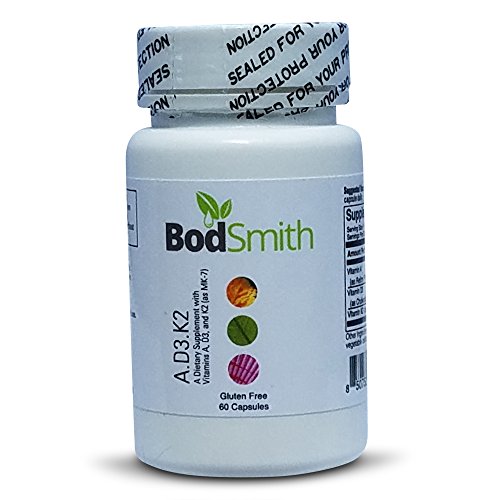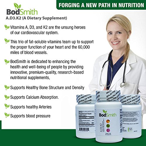 -. Binding : Health and Beauty -. Brand : BodSmith -. EAN : 0850752007051 -. Feature : Vitamin A.D3 and K2 are the unsung heroes of our cardiovascular system. / This trio of fat-soluble vitamins team up to support the proper function of your heart and blood vessels. / Supports healthy bone structure and density / Supports Calcium absorption / Supports healthy arteries and blood pressure -. IsAdultProduct : 0 -. Label : BodSmith -. Manufacturer : BodSmith -. MPN : 31310200 -. PackageQuantity : 1 -. PartNumber : 31310200 -. ProductGroup : Health and Beauty -. ProductTypeName : HEALTH_PERSONAL_CARE -. Publisher : BodSmith -. Studio : BodSmith -. Title : BodSmith A.D3.K2 Vitamins ADK Premium Quality Research Based Nutritional Supplement Complex for Strong Bones and a Healthy Heart 60 ct. -. UPC : 850752007051