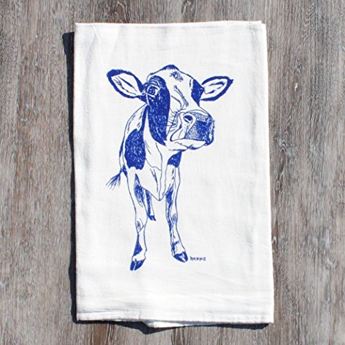 -. Title : Tea Towel - Flour Sack Cotton Kitchen Table Linens - Screen P.R.Inted Blue Cow