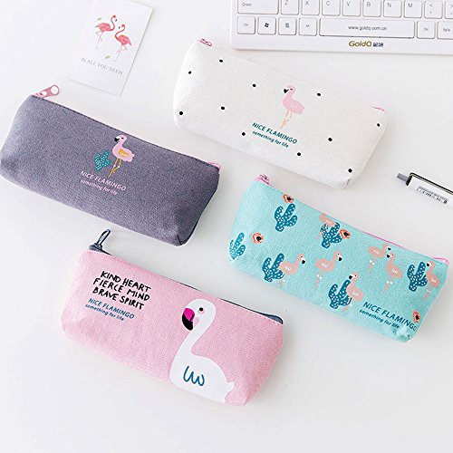 Set of 8, Students School Supply Stationery Organizer Canvas Cosmetic Bag Green Cactus and Flamingo Pencil Case(4 Cases, 4 Gel pens)