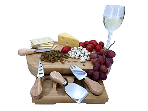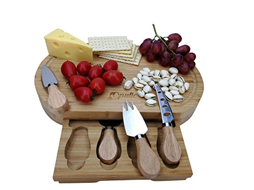 Opulic Bamboo Cheese Board and Knife Set – Charcuterie Wooden Serving Board, Comes Complete with 4 Cheese Knives in a Slide-Out Drawer, Great as Party Platter for Cheese Lovers