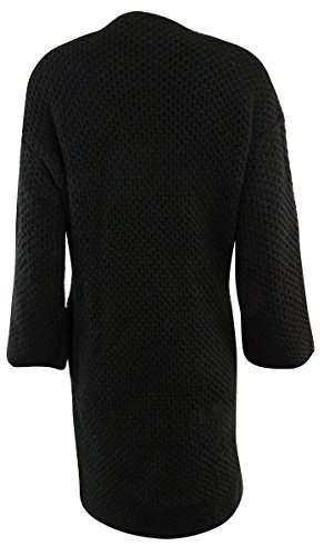 Jacket features no lining, knit wool blend fabric, long sleeves, faux leather trim, inseam pockets, and open front-no closure.