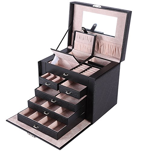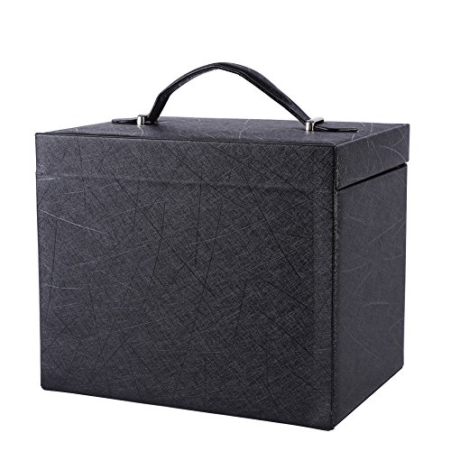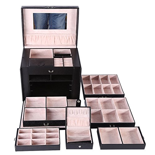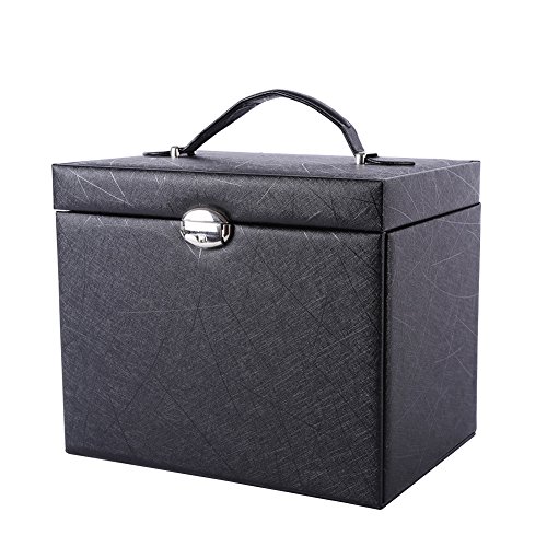 -. Feature : 4 removable drawers for maximum jewelry storage. / It measures 10.4"L x 9"W x 7.8"H when closed. / Material: Black Faux Leather, Medium Density Fiberboard (MDF), Beige Velvet / Handle and mirror provided, snap closure with keys make sure of safety / Multi-functional jewelry case, suits for necklaces, bracelets, watches, earrings, ear studs, hairpins, cufflinks, brooches and other jewelry