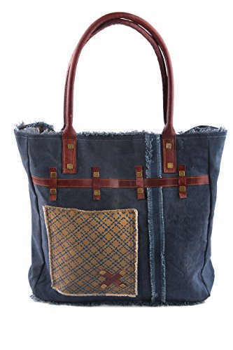 - The Indigo canvas tote bag has a snazzy blue and beige colored patch on dark navy canvas.