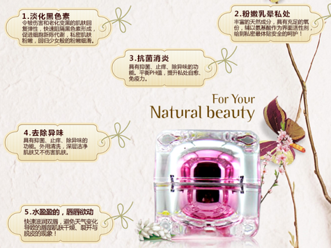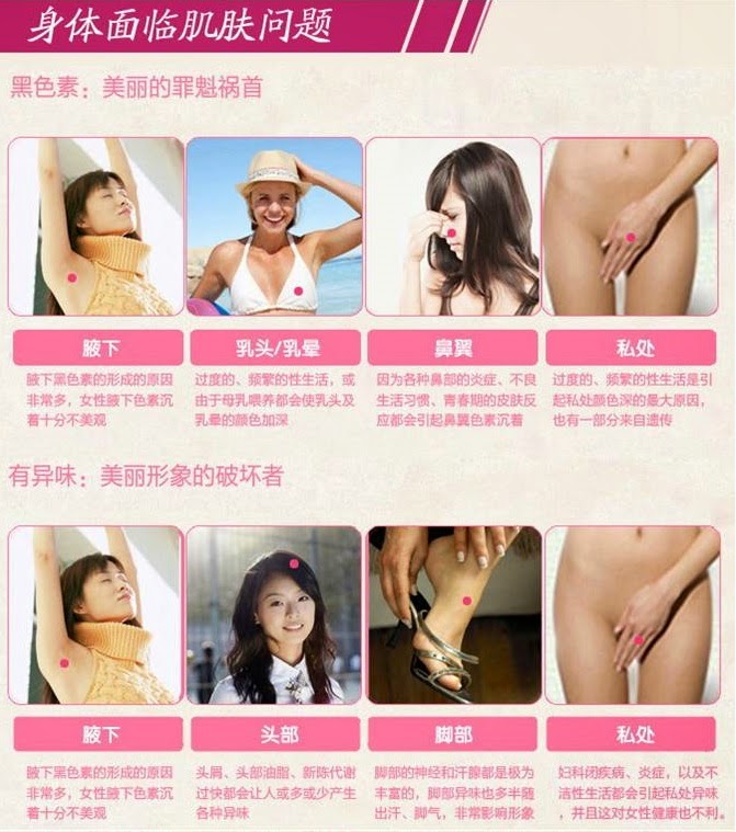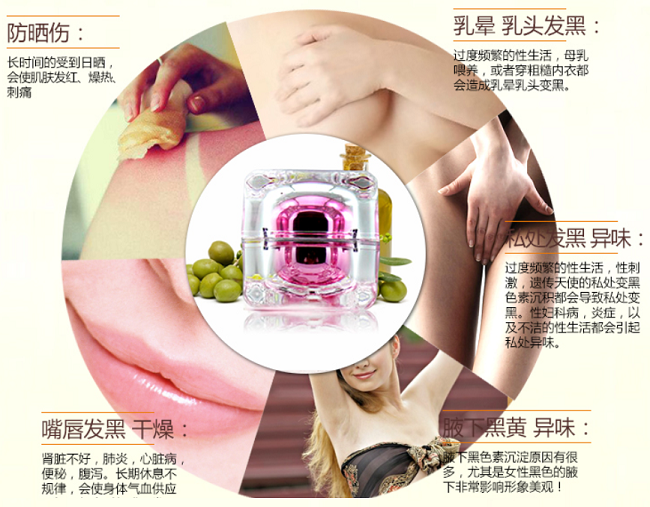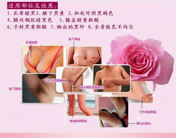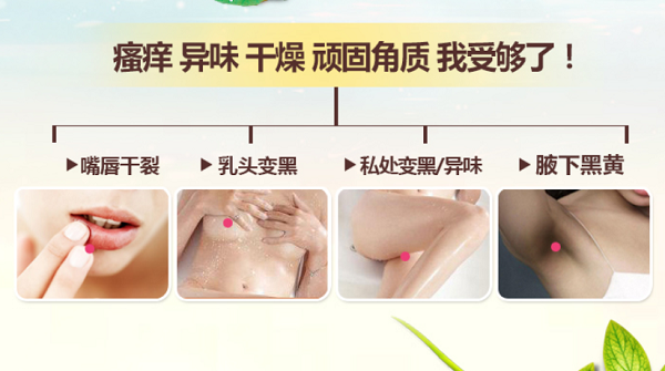 【产品功效】 - 100%纯植物萃取,平衡肌肤环境,促进局部肌肤的血液循环与新陈代谢,有效淡化、阻断黑色素的生成,真正黑色素导出原理,不伤害皮肤,内在调理不反弹。 三重功效:唇部嫩红、乳晕嫩红、私处嫩红,无需再用唇膏,告别口红的重金属,祛除乳晕和私密暗沉色,拥有诱人红润色彩,持久保持,吃东西都不掉色哦!无激 素无刺激无副作用。也可用于改善腋下、大腿内侧、手肘、足膝等暗沉、粗糙问题,粉嫩MM的神奇宝物!