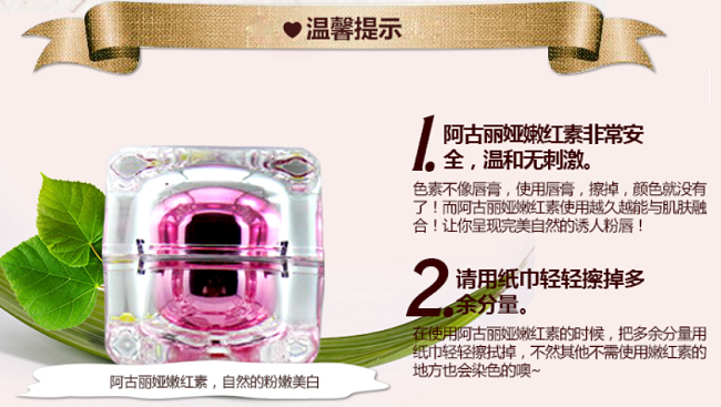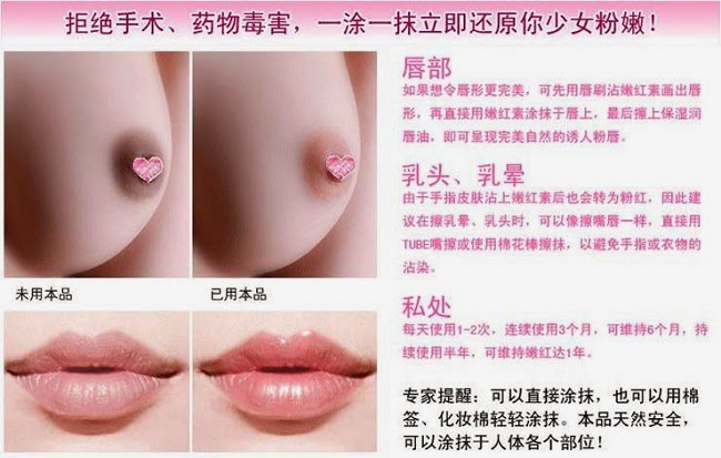 【使用方式】 - 清洁皮肤后,用棉签取少量均匀涂抹嘴唇(少量使用是很粉嫩的哟,如果喜欢颜色深一点的MM可以相对多用一点点的哈),乳晕,私处及需要粉嫩的身体部 位,15分钟后用纸巾擦去,无需冲洗。每天1-2次,可保持整天粉嫩红润。纯草本提炼,适用于唇部,乳晕,私处。檫了会有嫩嫩粉色 每个人的嘴唇颜色不一样 它会跟这嘴巴自动变化颜色。