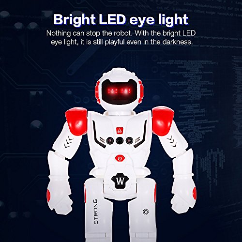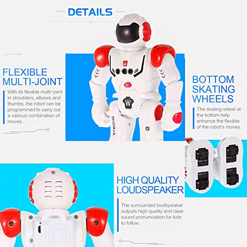 -. Feature : It can slide forward/backward, slide forward/backward, turn left/right. / The robot can sing and dance to entertain you. / The robot can be programmed to carry out movements as you create. / Gesture control: using simple gestures, the robot can react to your gestures with basic movements, along with sound effects. / With the rotating wheel at the bottom, it will avoid obstacle without tripped.