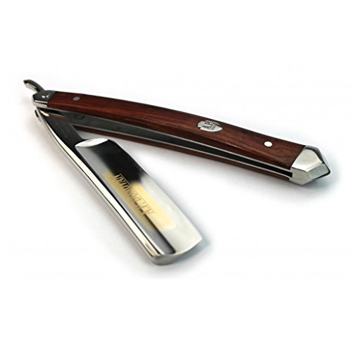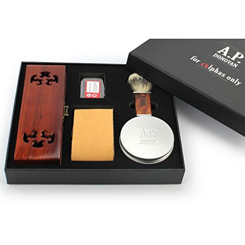 -. Feature : The quality of the razor blade determines the thoroughness of the shave - The steel used for this razor is a particularly high-quality alloy: Japanese steel, similar to the known as White Steel-Shiro Gami steel. This carbon steel achieves a hardness of 63 Rockwell and enables the production enormously sharp blades. The pressure applied to the highly polished razor blade means gold etching logo stands for quality. / Whether well balanced in the hand is your razor, is heavily dependent on the weight ratio between blade and handle dependent. As a natural material give you heavy hardwoods best conditions to oppose the blade steel an adequate weight. For those prepared carefully by hand grips this razor mahogany wood from the forests of Madagascar are used. You will be fascinated by this successful symbiosis of steel and precious wood. / The shaving brush in A.P. Donovan offer are exclusively equipped with the highest quality material: hair from Badger. The hair is stylishly set in a handle made of fine mahogany wood and stainless steel. This decorative Shaving is an investment for many years with good care. The fragrant, skin care Shaving from AP Donovan is specially designed for use with our exclusive shaving brushes. For a more thorough and skin-gentle shaving experience. / The A.P. Donovan leather strap is on one side of Kazakh cow, on the other side of robust linen fabric. The abrasive effect of the leather is about the 100,000 grain of a grindstone. Use the metal carabiner belt is mounted on a suitable wall hook. The A.P. Donovan abrasive paste consists of a plurality of mineral components as well as micro-fine abrasive particles and enhances the abrasive action of the leather by about two times. / Each razor of A. P. Donovan comes in a decorative real wood box. The noble character of the gift box is highlighted by arabesque carvings hole in the lid and the finely crafted metal buckle. A velourbeschichtete foam insert inside reliably prevents scratches on handle and blade razor. As a personal gift case or for safe transport for traveling: This box proves a quality razor honor.
