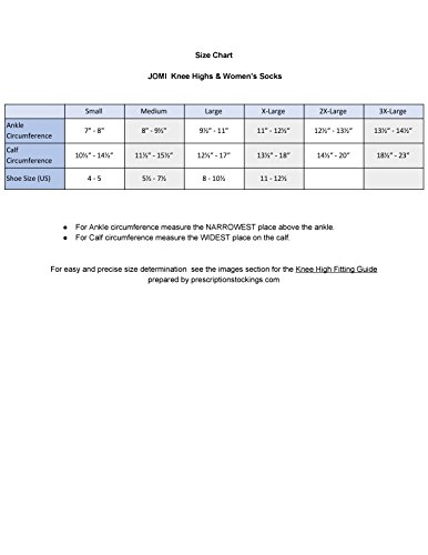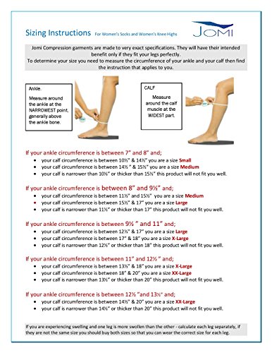 Jomi Sock Collection Includes Cotton, CoolMax and Microfiber socks. Cotton is the thickest and desired for its warmth and softness, CoolMax is desired for its moisture wicking capability and Microfiber is the lightest and most dressy. About Jomi Collections. Jomi offers a variety of styles to fit your preference. Our Surgical Collection of Unisex style- Knee highs, Thigh highs and Pantyhose; are made of a strong Nylon and Spandex material. Our Opaque Collection of Women's Knee highs and Pantyhose; are not as thick as the Surgical Collection, they are made of a of softer slightly semi-sheer material that has a luxurious feel. Our Sheer Collection of Women's Knee highs, Thigh highs and Pantyhose; are made of a silky smooth sheer fabric that is flexible but snug and looks like regular sheer hosiery. Our Men's Collection of Socks and Leotards; are made of a comfortable dress sock material and designed specifically for men. Our Sock Collection Includes Cotton, CoolMax and Microfiber socks. Each collection includes styles in various compression levels, colors and options. Search the JOMI storefront for the products that you prefer. About the Jomi Brand. Our compression garments are all made in a FDA approved and ISO certified factory here in the USA. These medical quality garments have been sold in select Surgical Supply stores on the East Coast since 2011. They are in demand because they are made to the same standard as the heavily advertised brands, yet are more affordable. Please note;The only way to properly fit quality support hose is by measuring the circumference of your leg. Please follow the sizing instructions in the images section to determine your size. Even if you have previously purchased support hosiery, it is important that you check our size guidelines as sizing criteria varies from brand to brand and from product to product. 0 |