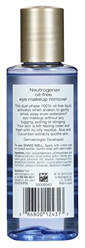 Neutrogena Oil-free Eye Makeup Remover. This dual-phase 100% oil-free liquid activates when shaken to effectively and gently whisk away even waterproof eye makeup without any tugging, pulling or stinging. You skin is left feeling clean and fresh with no oily residue [3.8oz]Feature