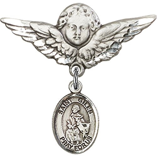 -. Title : Sterling Silver Baby Badge with St. Giles Charm and Angel w/Wings Badge Pin 1 1/8 X 1 1/8 inches