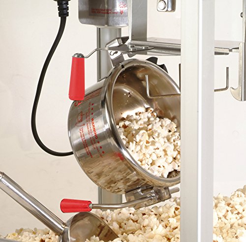 Family and friends can enjoy traditional hot oil kettle popcorn with Elite's classic style tabletop popcorn popper. Features include a 8-ounce stainless steel kettle with built in stirring system, plexiglass windows and door, bottom warmer, and warming light to keep popcorn hot. Popcorn Popper has electroplated stainless steel handles and wheels. Easy to clean detachable stainless steel 8-ounce popping kettle. Makes up to 3-1/2-gallon of popcorn per batch. Includes all stainless steel accessories: detachable 8-ounce kettle, salt shaker, popcorn scoop, measuring cup and spoon.Feature