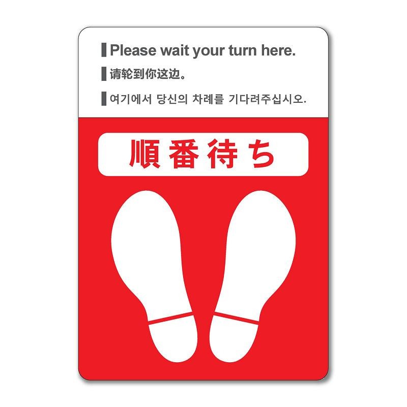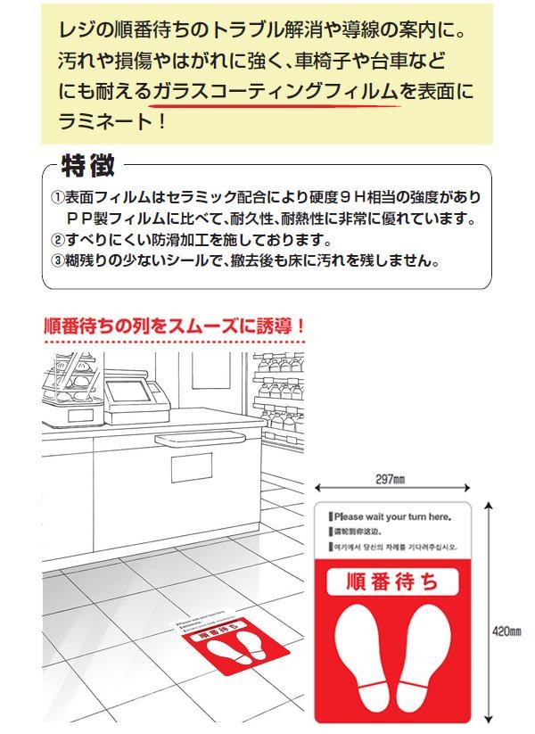 | ガラスコーティングフィルムを表面にラミネートした、耐久性抜群のフロア誘導シールです。日本語のほか、英語・中国語・韓国語での表記付きで他国のお客様にも対応しております。コンビニ・ドラッグストアなど、屋内の行列のできるあらゆる場所でお使いいただけます。長期に渡って使用感を感じさせず、店舗の美観を保てます(想定期間は通常使用で約2年の目安)。光沢があるタイプなので、視認性にも優れています。 |