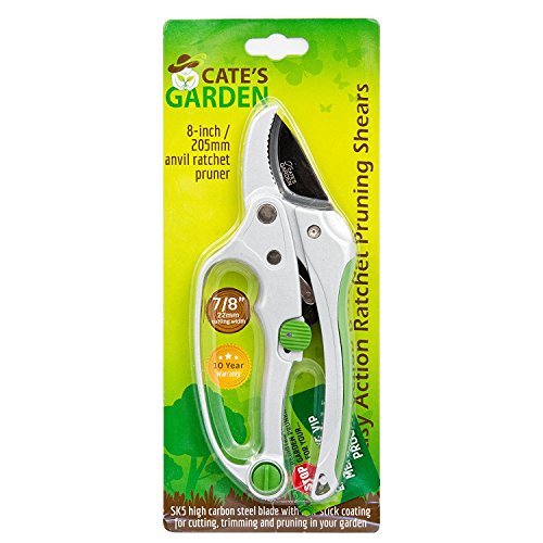 Ratchet Pruning Shears – Cate’s Garden 8” Easy Action Anvil-type Pruners Designed for Effortless Trimming of Hedges and Tree Limbs - Heavy Duty SK5 High Carbon Blades for Long-lasting Durability