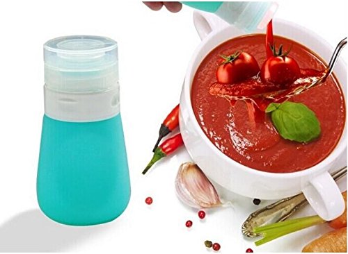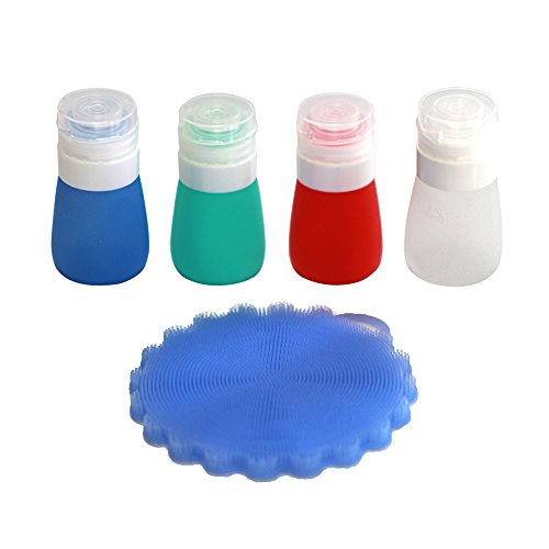 Features: Material- FDA Approved 100% food grade silicone Colour-blue, green, red, white Size: 37ML 55ML 85ML Leak proof flip top cap. BPA-free and safe. Easy and convenient way to transport your favorite dressing on-the-go Easy to squeeze silicone container Package included: 4 x salad dressing bottles and a high quality silicone dish scrubbers