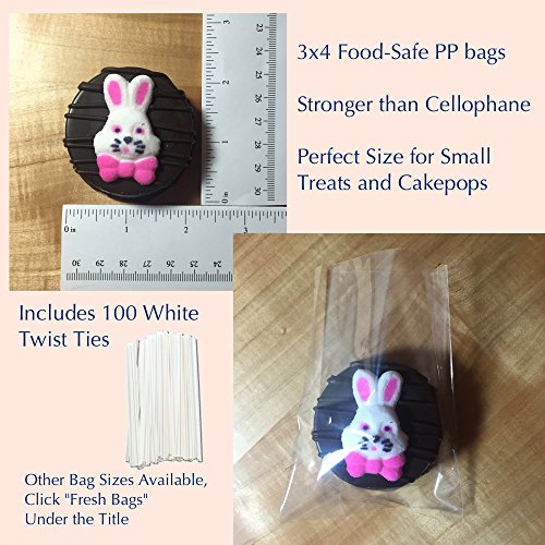 - INCLUDES 100 3x4” Bags, 100 4" White Twist Ties. Perfect Bundle for your Homemade Cakepops, Lollipops, Nuts, Cookies, Treats, Snacks, Prizes, Party Favors, Chocolate, Cake pops, Berries, Beads, Dried Fruit, Jellybeans, or Anything You Want to Keep Fresh! Bags Can be Sealed with a HEAT SEALER or the INCLUDED White Twist Ties. These Bags are 100% RECYCLABLE. *NEW* 3 sizes now available! 3x4", 4x6" and 5.75x7.75"