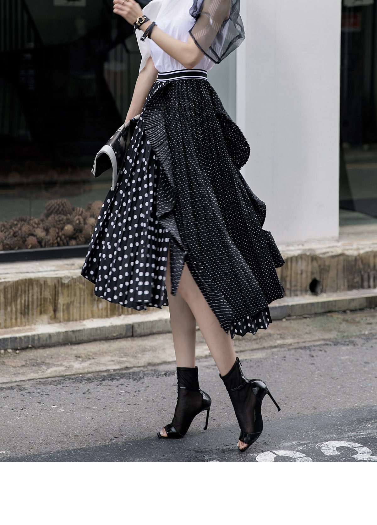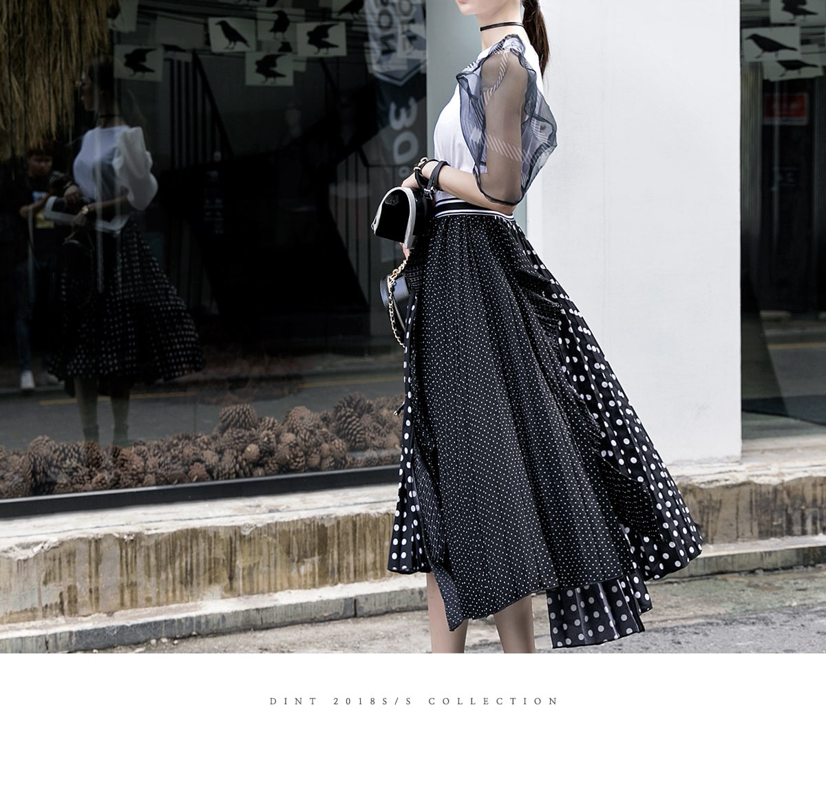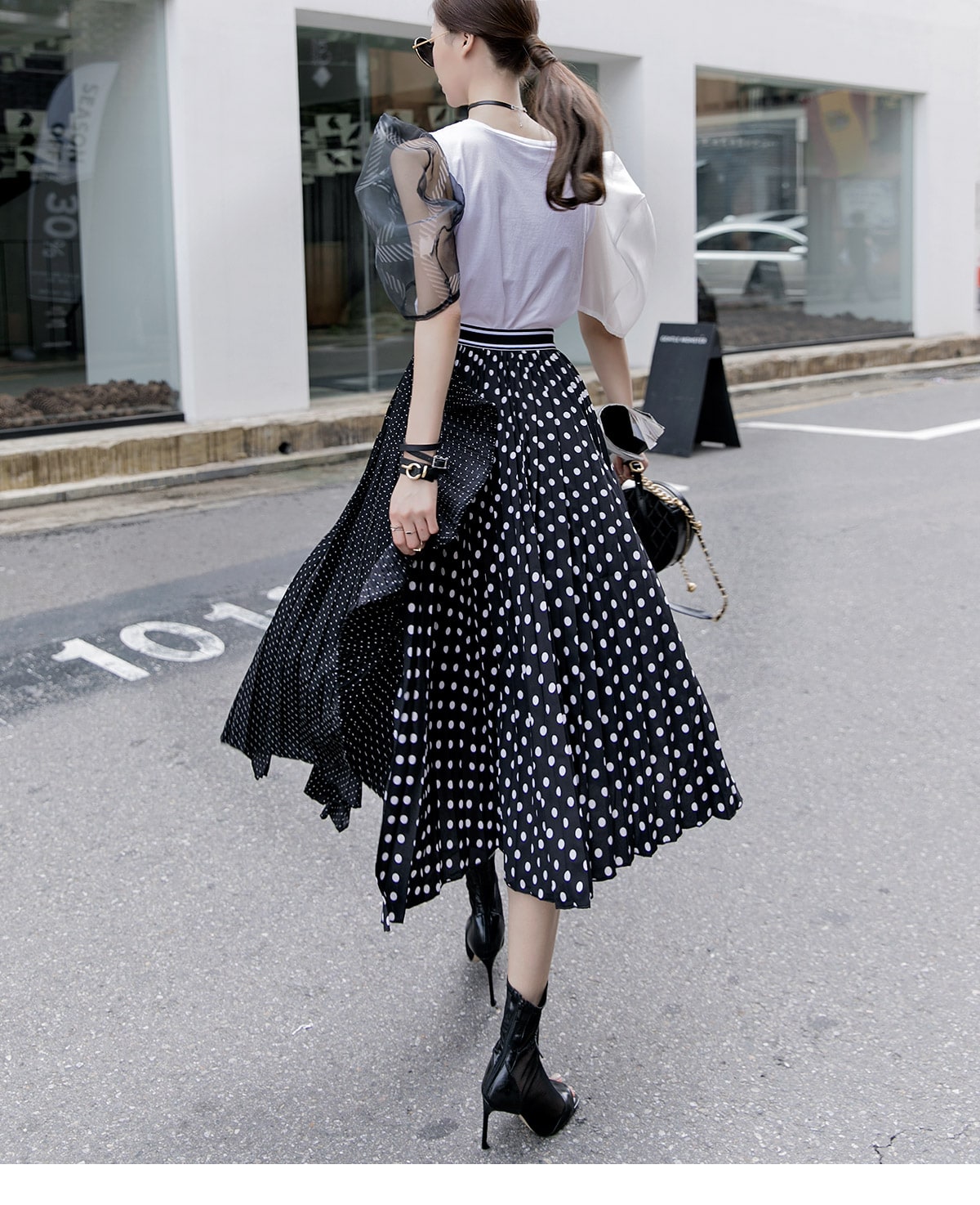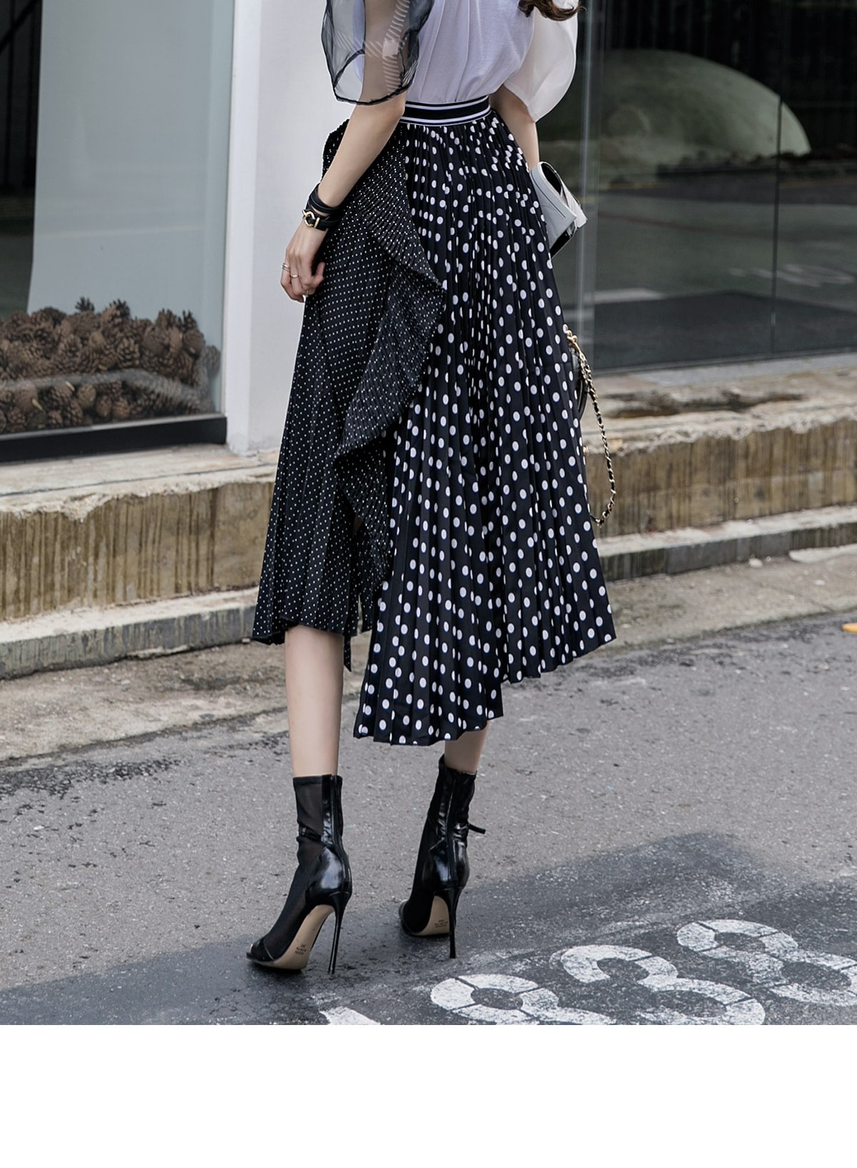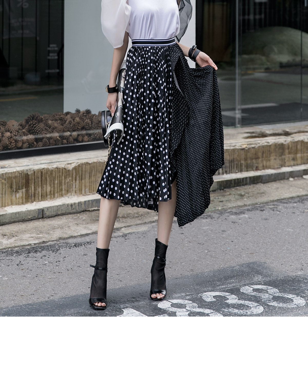 SK1730 언발 도트 플리츠 라인 스커트 Black