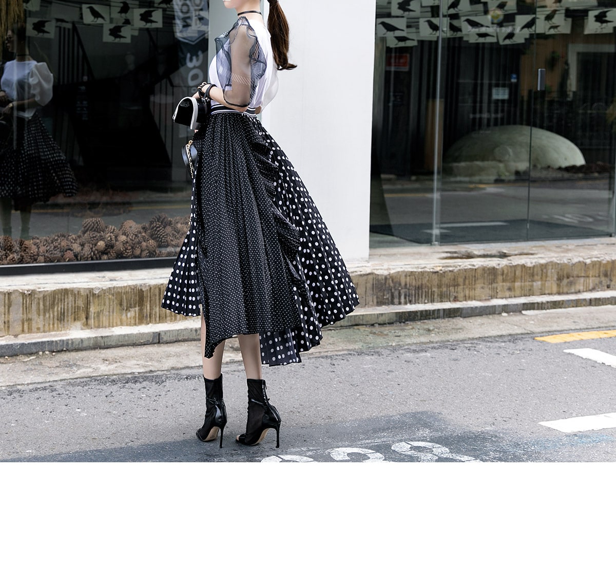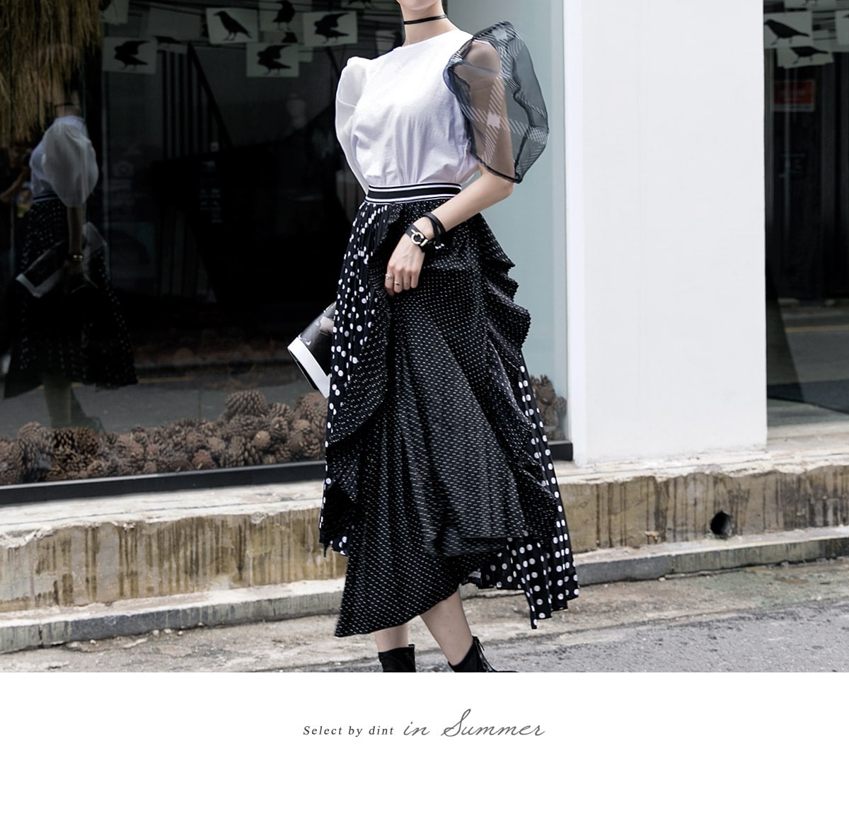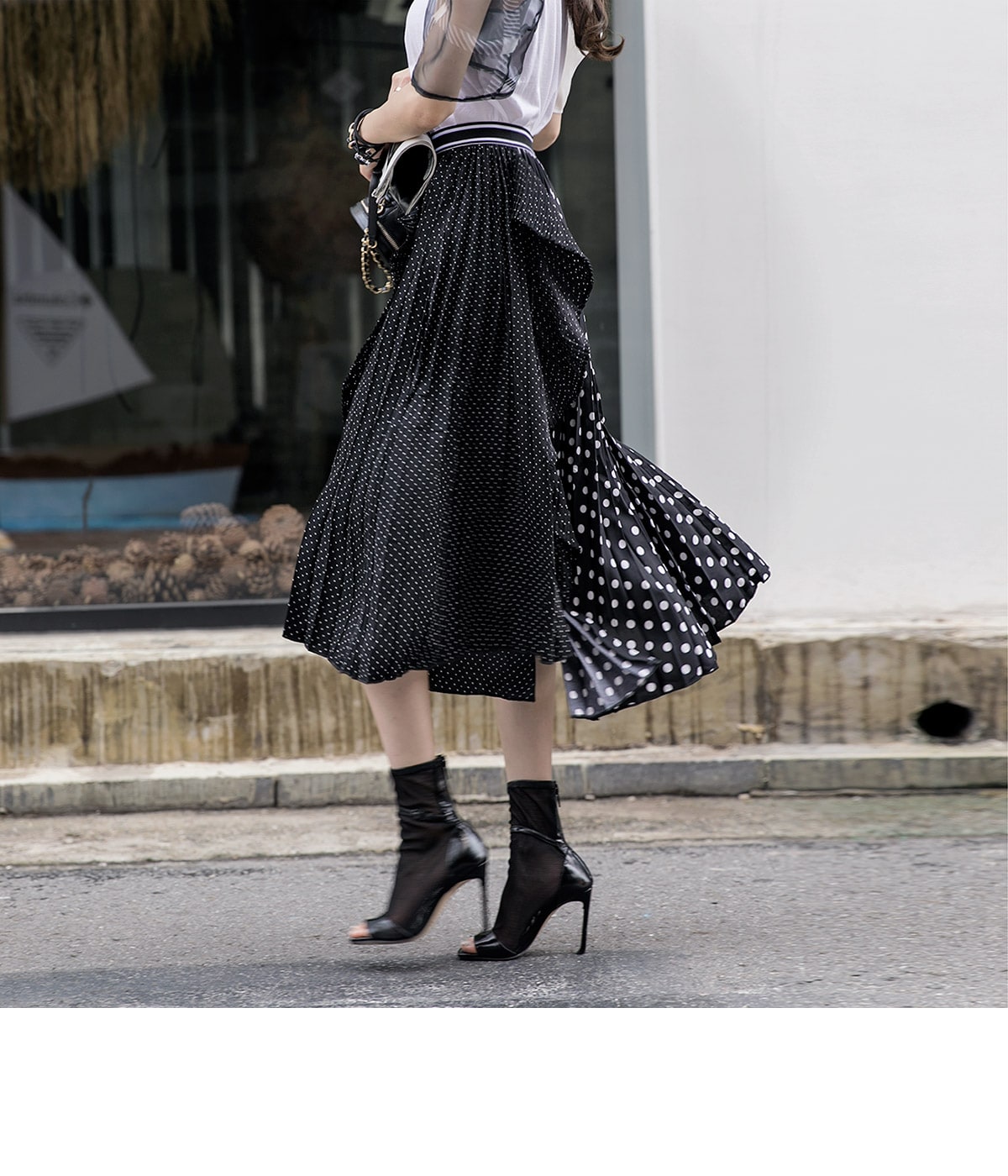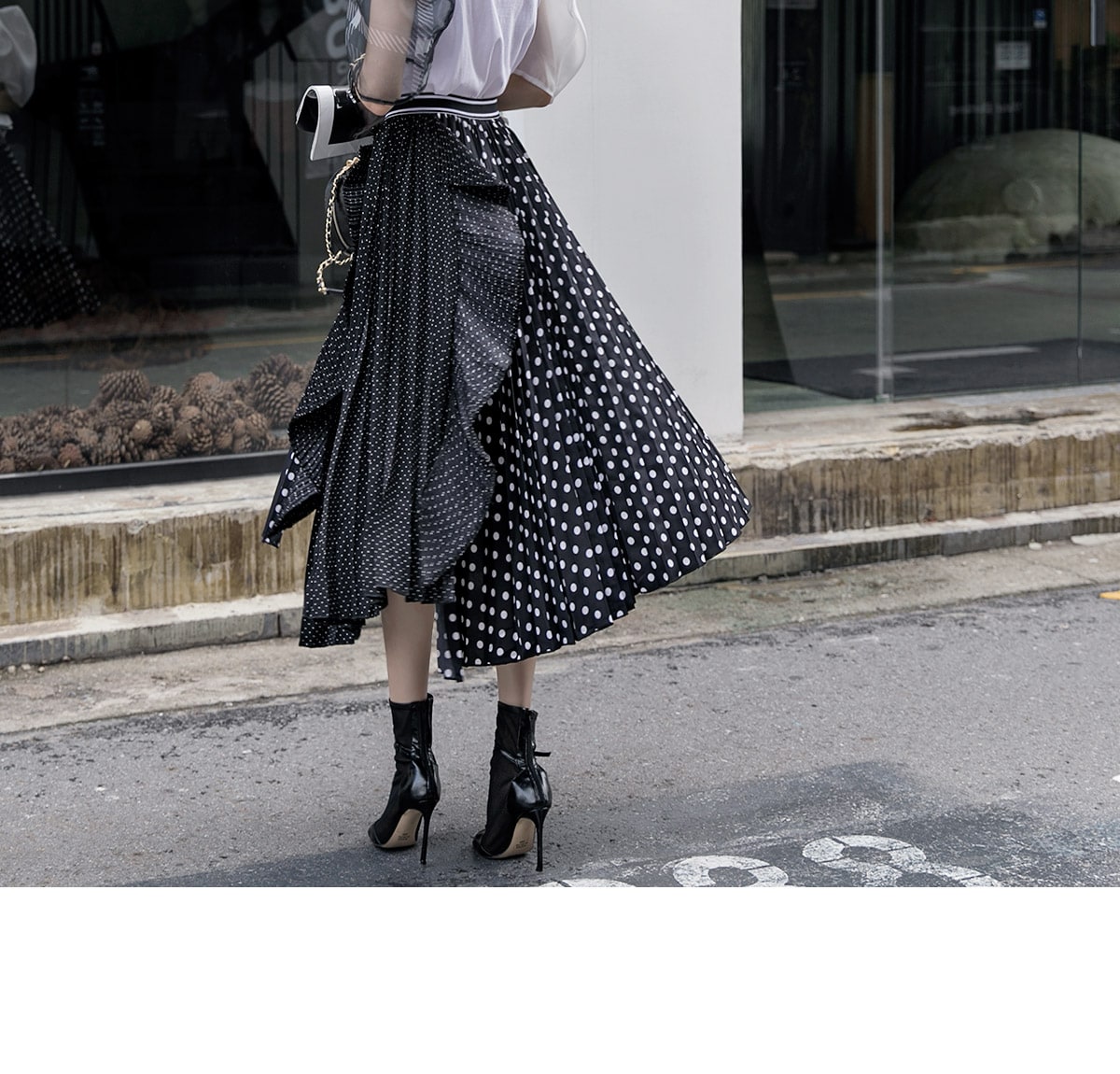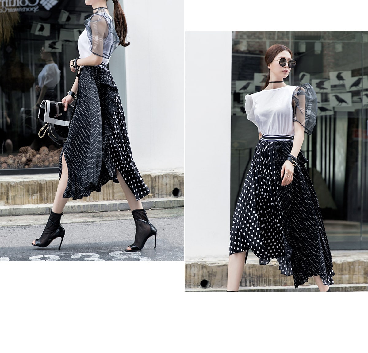 SK1730 언발 도트 플리츠 라인 스커트 Black