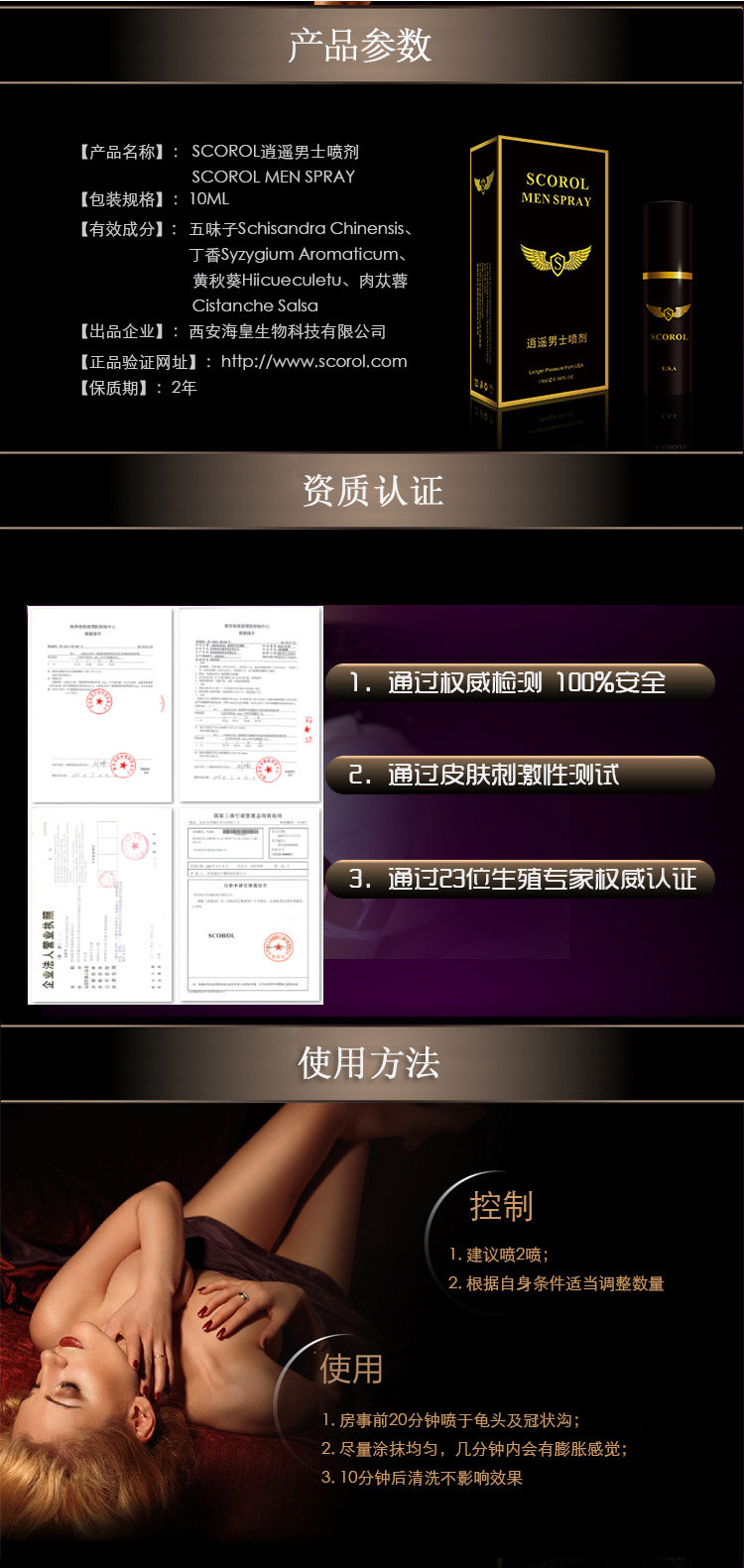 产品通过纯天然植物萃取成分的,具有促进血液循环,滋阴补阳的效果,是绝对安全,绝对没有任何副作用的,及时你停止使用逍遥喷剂以后,性机能不会衰退,绝无副作用和依赖性,可放心使用!