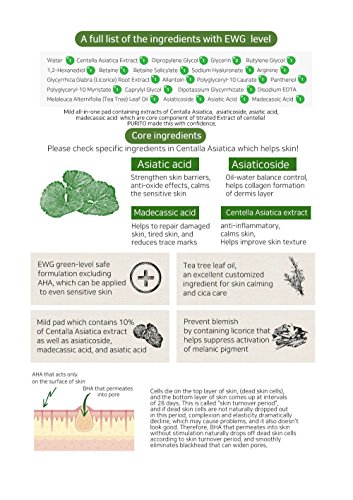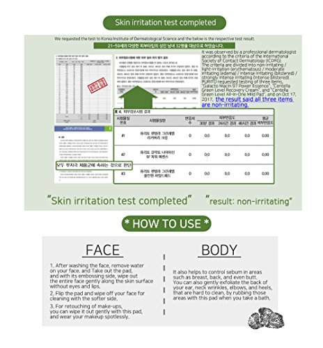 Formulated with Betaine Salicylate (BHA) helps eliminate various wastes and dead skin cell that is remained even after washing and then highly concentrated Centella Asiatica extract,Asiaticoside,Asiatic Acid and Madecassic Acid help defending skin barrier system as well as help in caring sebum and pimple,this is mild daily peeling pad which can be used every day with ensured safe green level ingredients How to use : 1. After cleansing ,softly swipe the embossing side all over the face except for eye and lip area 2. Swipe the opposite side of the pad all over the face to clear up the rest of debris 3. Make sure to close the lid to protect pads from drynessFeature