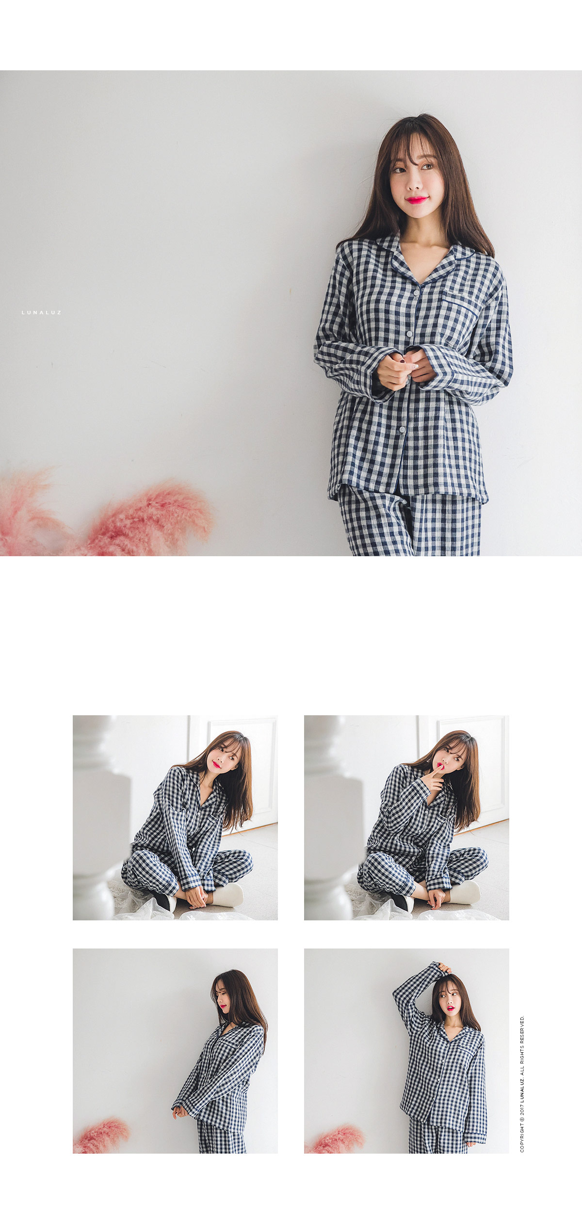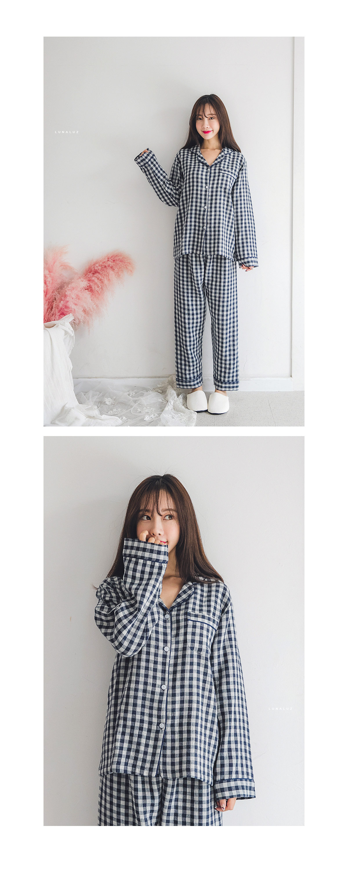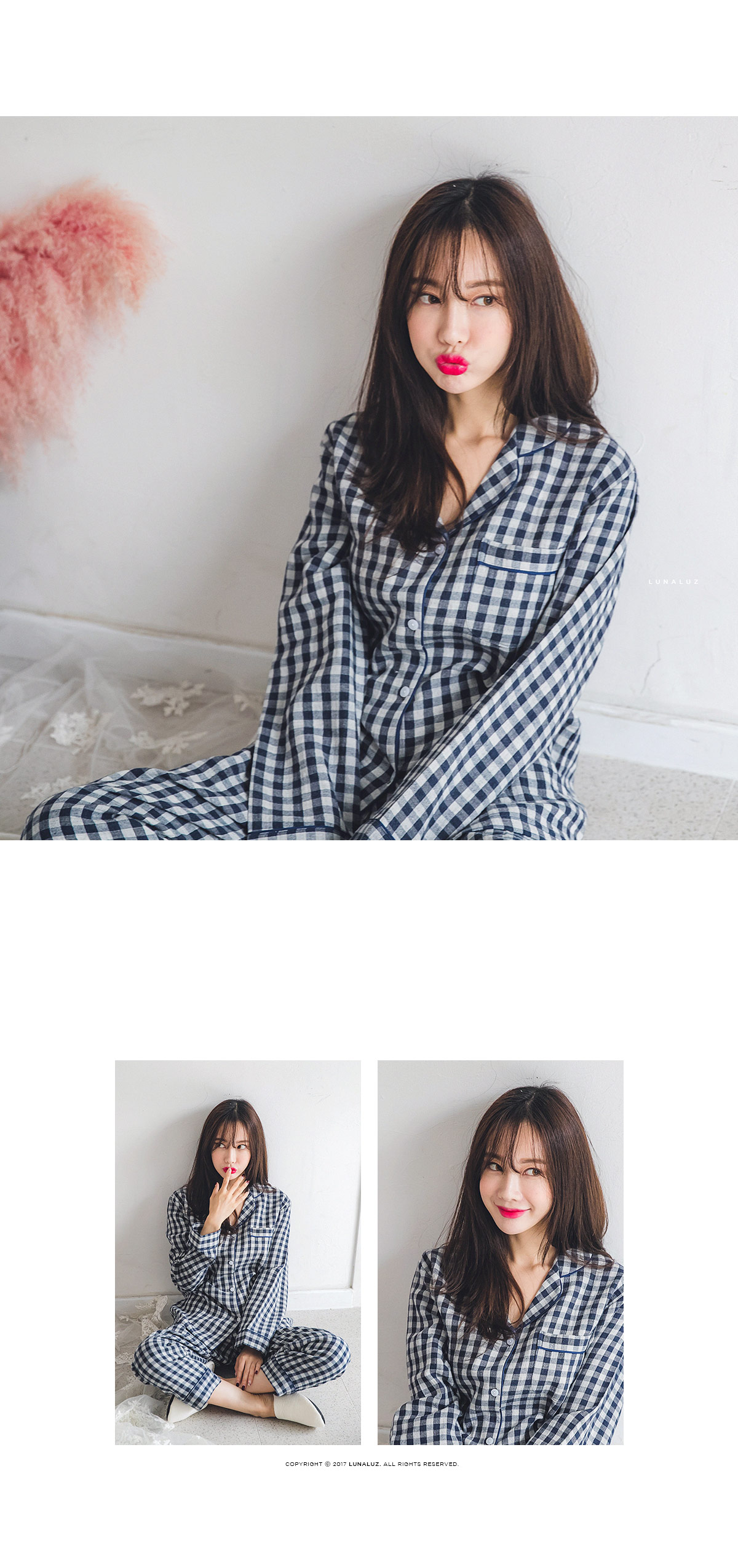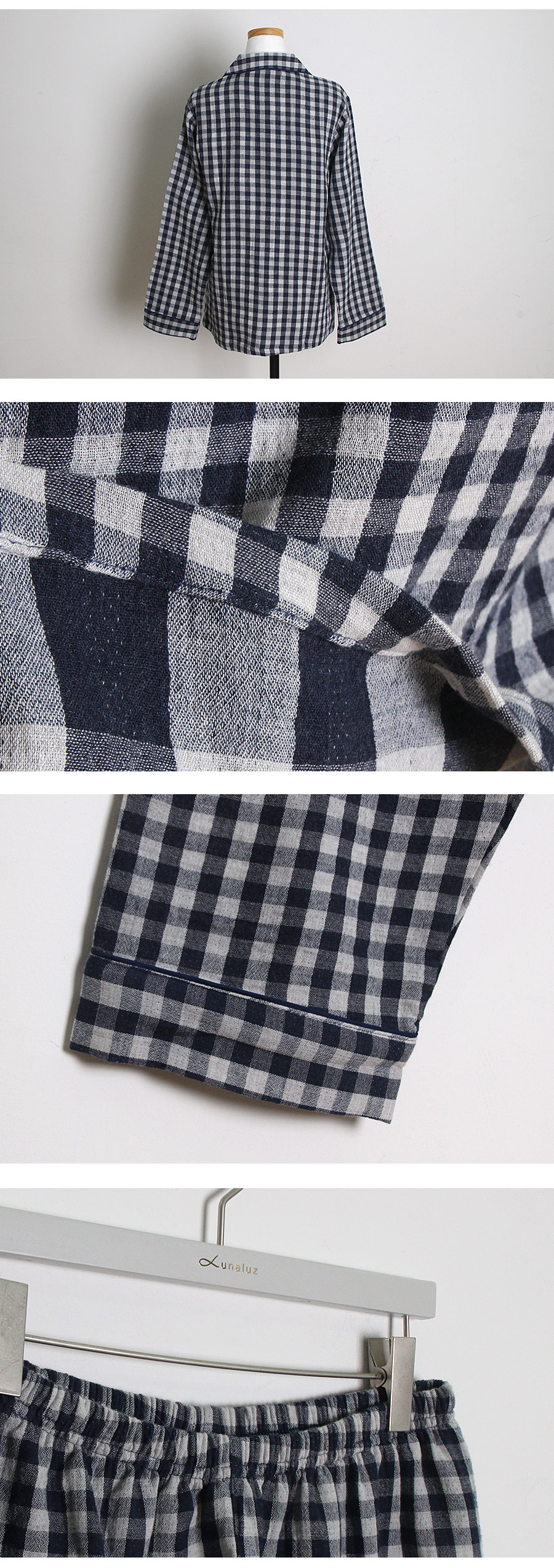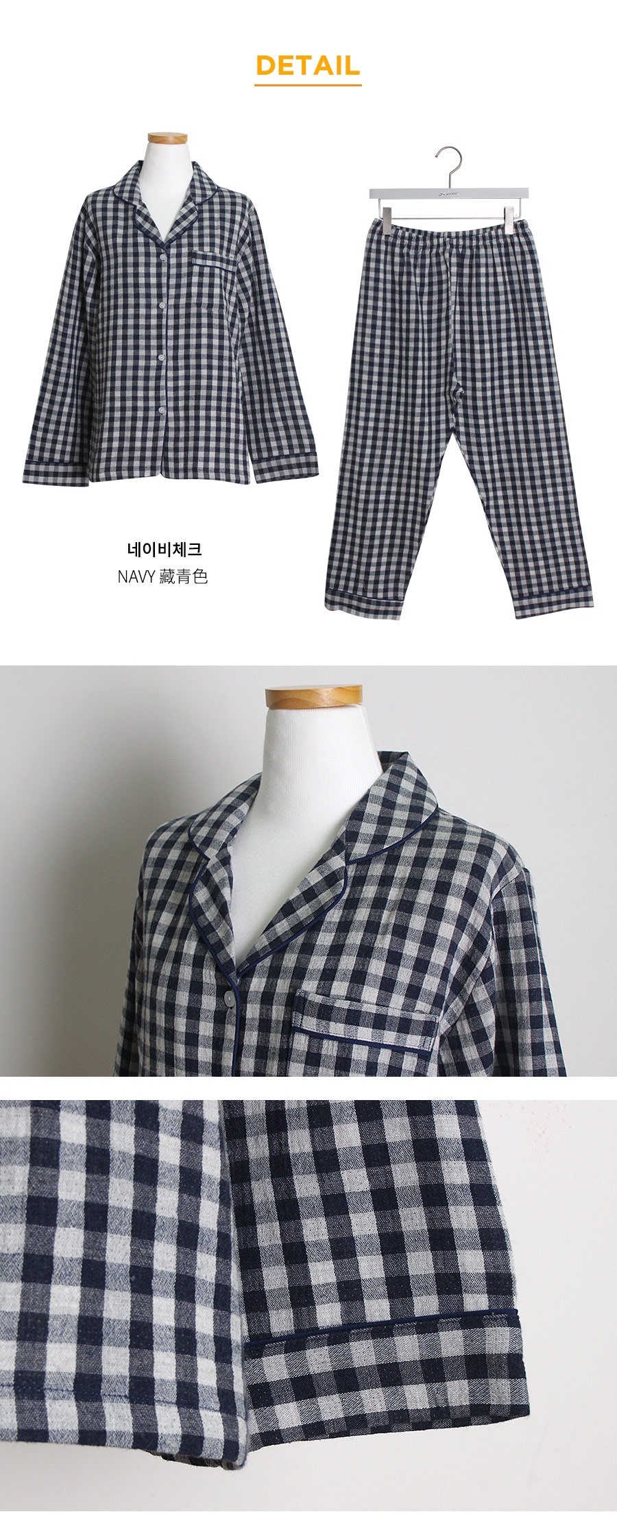네츄럴한 네이비 체크 컬러로 두루두루 잘 어울릴 스타일의 코지한 잠옷이에요. 폭닥한 이중지면으로 포근하고 터칭감이 좋습니다. 겉면과 안쪽면이 다른 체크패턴으로 언발란스한 디자인이 매력적인 소재랍니다. 따뜻하고, 아늑한 느낌이 감도는 체크 잠옷으로 적극 추천해드려요~! DETAIL깔끔한 포켓 카라 스타일의 잠옷으로 고급스러운 네이비 파이핑을 카라 부분에서 클로징까지 꼼꼼하게 봉제해 포인트를 주었습니다. 손목과 발목에도 둘러주어 깔끔하게 완성도를 높여주었습니다. 100% 국내제작으로 봉제선이 깔끔하고, 디자인과 소재의 퀄리티가 높습니다. SIZE44반size~66size 까지 가능한 free사이즈의 잠옷입니다.