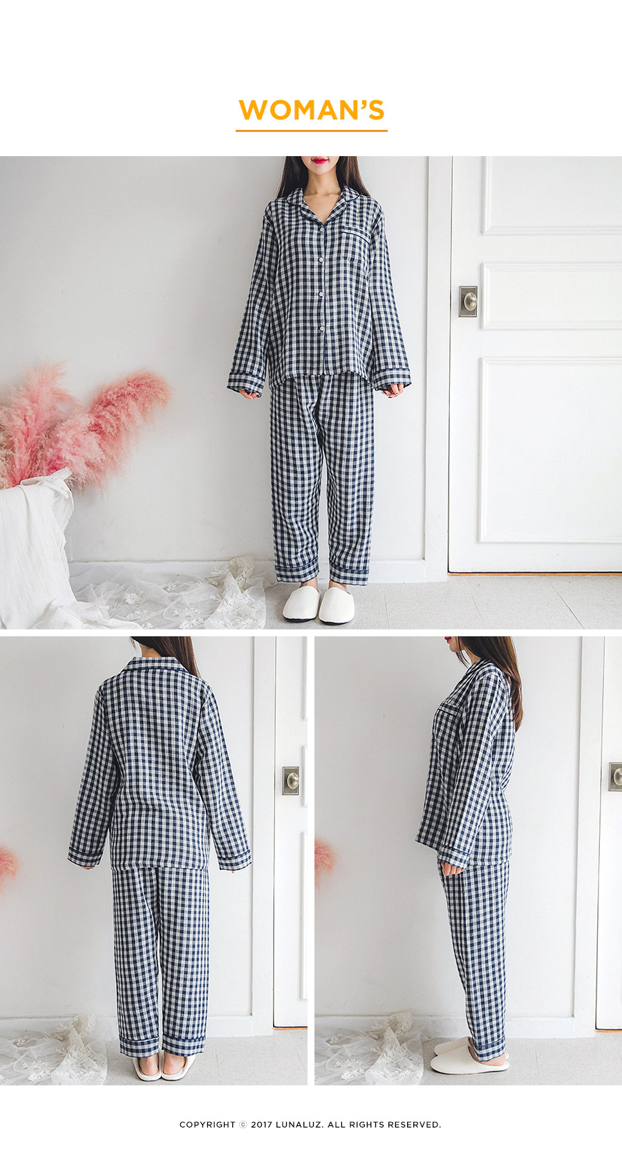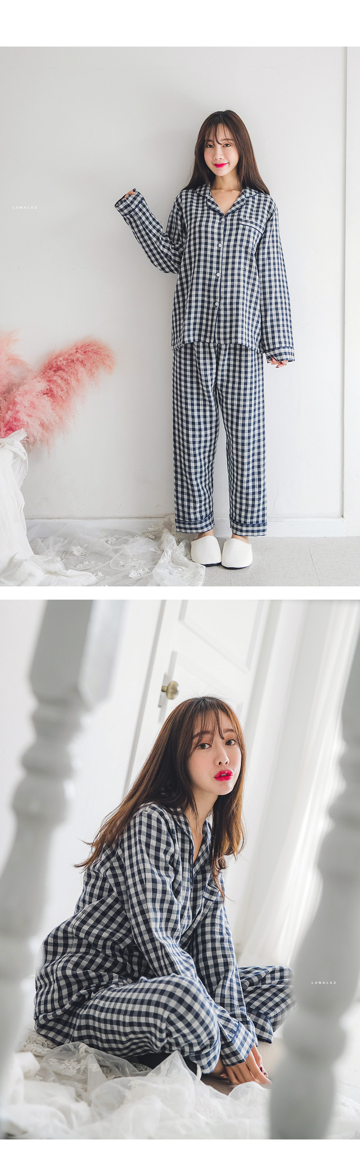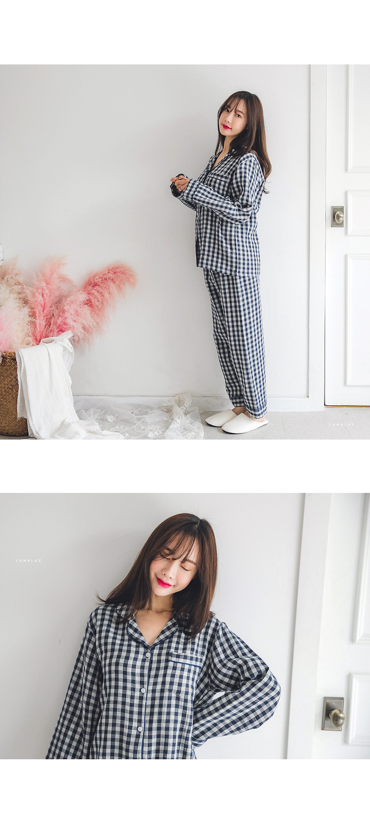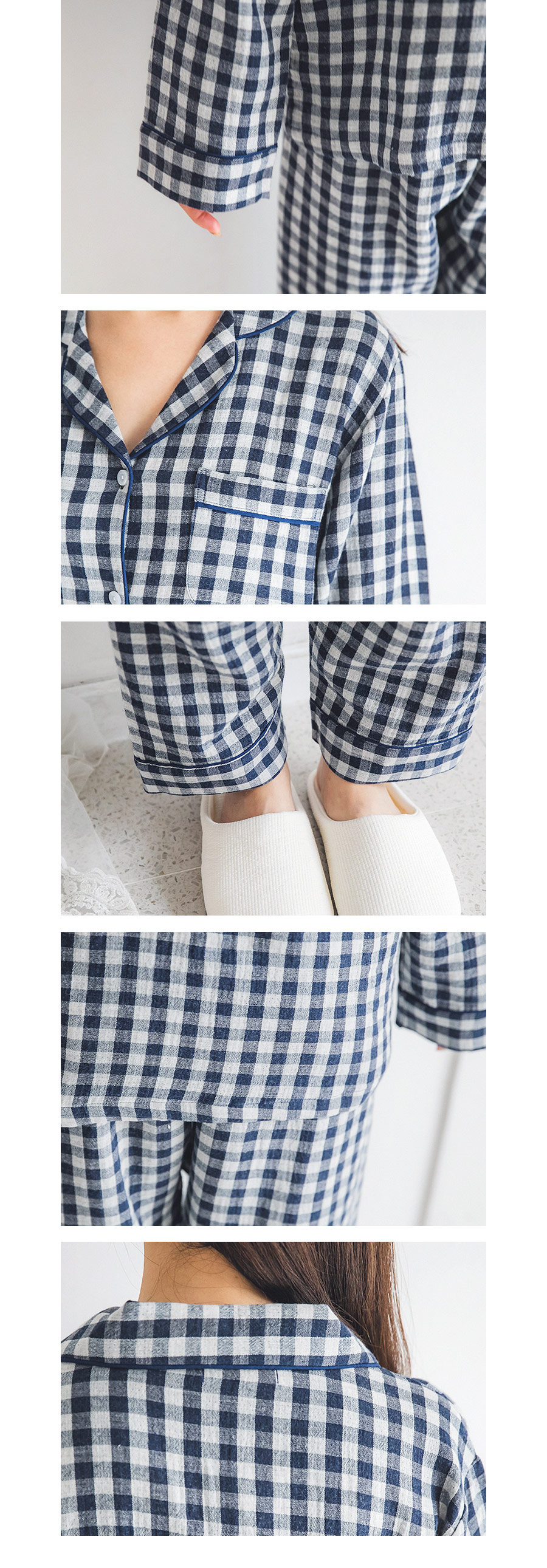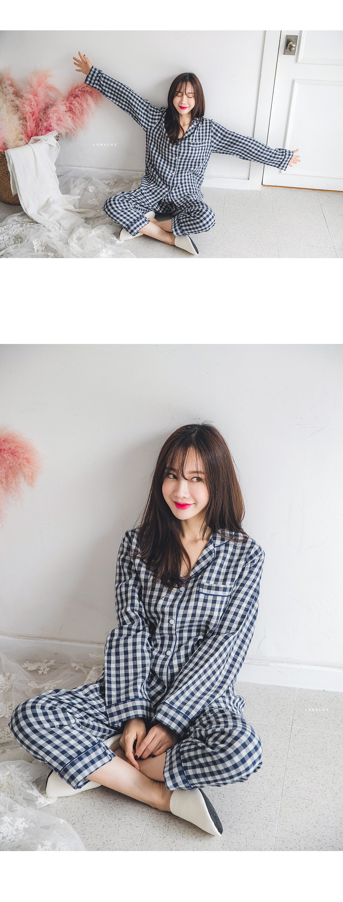 네츄럴한 네이비 체크 컬러로 두루두루 잘 어울릴 스타일의 코지한 잠옷이에요. 폭닥한 이중지면으로 포근하고 터칭감이 좋습니다. 겉면과 안쪽면이 다른 체크패턴으로 언발란스한 디자인이 매력적인 소재랍니다. 따뜻하고, 아늑한 느낌이 감도는 체크 잠옷으로 적극 추천해드려요~! DETAIL깔끔한 포켓 카라 스타일의 잠옷으로 고급스러운 네이비 파이핑을 카라 부분에서 클로징까지 꼼꼼하게 봉제해 포인트를 주었습니다. 손목과 발목에도 둘러주어 깔끔하게 완성도를 높여주었습니다. 100% 국내제작으로 봉제선이 깔끔하고, 디자인과 소재의 퀄리티가 높습니다. SIZE44반size~66size 까지 가능한 free사이즈의 잠옷입니다.