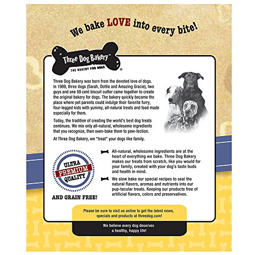 -. Binding : Misc. -. Brand : Three Dog Bakery -. Label : Three Dog Bakery -. Manufacturer : Three Dog Bakery -. PackageQuantity : 1 -. ProductGroup : Pet Products -. ProductTypeName : PET_SUPPLIES -. Publisher : Three Dog Bakery -. Studio : Three Dog Bakery -. Title : Three Dog Bakery Grain Free Wafers Baked Dog Treats, 13 oz