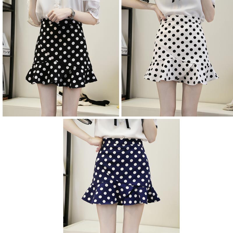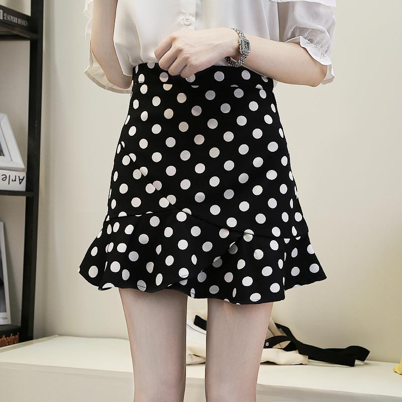 大きめのドットプリント柄の裾フリルデザイン・ショート丈スカート♪