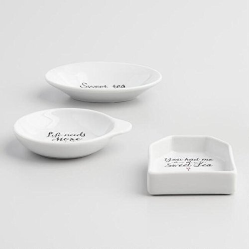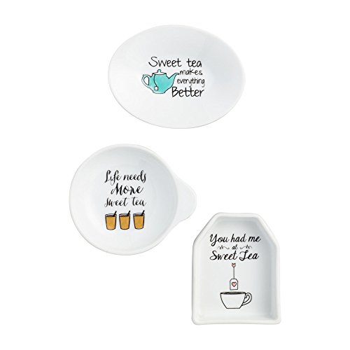 Studio : WM Publisher : WM Product Description Crafted of porcelain with charming sweet tea aphorisms in assorted designs. This tea rest set is a great gift for the tea lover and fun for entertaining. Each tea rest has a unique saying "Sweet Tea Makes Everything Better", "Life Needs More Sweet Tea Time", and "You Had Me At Sweet Tea". Dimensions: 3.03" - 3.66" W x 2.44" - 3.35" L each 0
