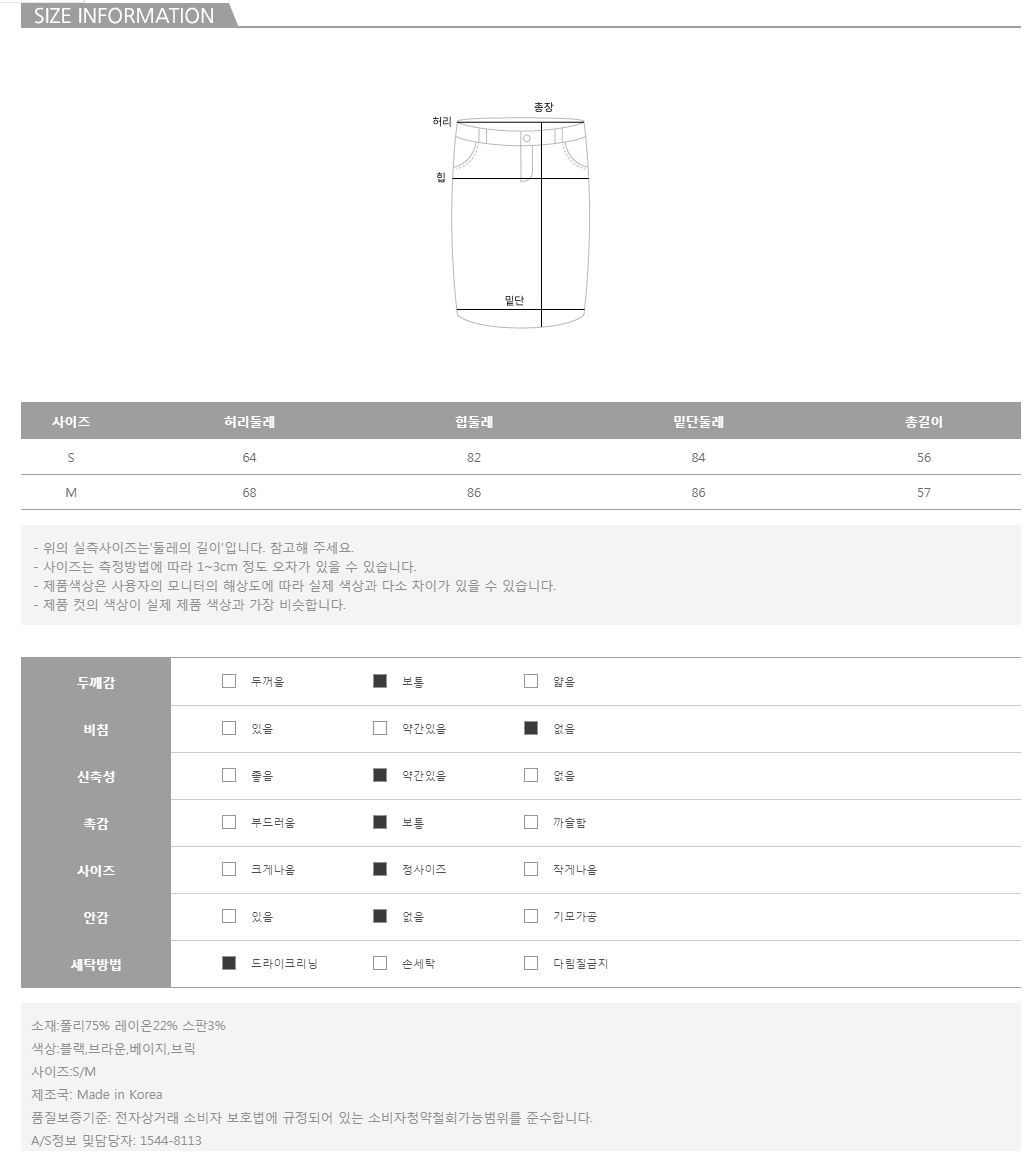 가볍고 유연한 폴리 매끈한 터칭감을 자랑하는 레이온 장시간 착용에도 나를 더 편안하게 만들어 줄 스판까지 가미 된 원단으로 편안한 착용감부터 매끈한 실루엣까지 모두 사로 잡았을 뿐만 아니라 베이직 라인의 스커트라 어떤 룩에도 자연스레 어울린다는 사실-! 또한 슬림하게 잡아주는 핏감과 함께 부담 없는 미디 기장으로 은근히 단아한 매력이 돋보이며 백 슬릿으로 활동성에도 한결 편안함을 살려주어 누구에게나 만족도 높은 스타일링이 가능하니 IT ITEM~ 총 4가지의 각양각색 컬러 구성으로 취향 따라 초이스 해보세요:)