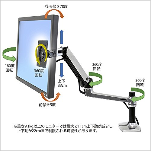 商品紹介LXデスクマウント液晶ディスプレイアーム/止めたいところでピタッと止まる!エルゴトロンの特許CF技術で、ワンタッチでモニタを任意の場所にセットできます。正しい姿勢でモニタを見ることで、目の疲れや背中の疲労などを軽減し、生産性と健康を向上させましょう。耐久性に優れデザイン性の高いポリッシュドアルミニウム加工。アームを折りたたむことでモニタをコンパクトに収納できます。モニターアーム売上ナンバーワン。伸縮64cm、上下昇降33cm、パン360度、縦横回転360度。