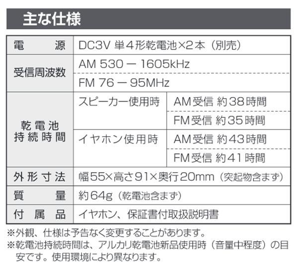 | ワイドFM(FM補完放送)対応の高感度コンパクトラジオです。小さくてもクリアな音質で、手のひらサイズだから携帯に便利!角を取ったラウンドフォルムで持ちやすい。モノラル受信・スピーカー搭載・イヤホン付属。 |