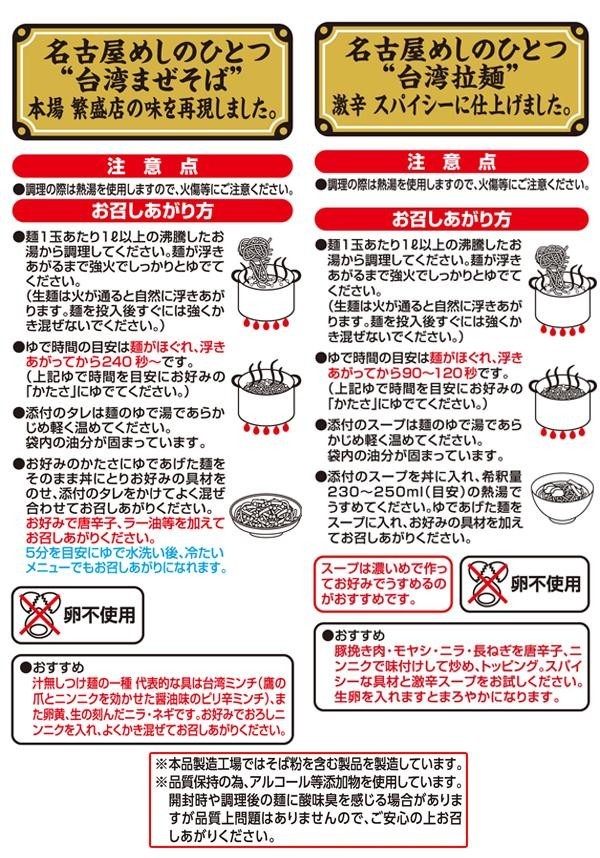 | 栄養成分 | ■めん(100gあたり) エネルギー:267kcal、たんぱく質:8.1g、脂質:0.9g、炭水化物:56.5g、ナトリウム:770mg(食塩相当量:2.0g) ■台湾まぜそばタレ(55gあたり) エネルギー:135kcal、たんぱく質:3.1g、脂質11.2g、炭水化物:5.4g、ナトリウム:920mg(食塩相当量:2.3g) ■台湾ラーメンスープ(39gあたり) エネルギー:86kcal、たんぱく質:3.5g、脂質6.3g、炭水化物:3.7g、ナトリウム:2300mg(食塩相当量:6.0g) |