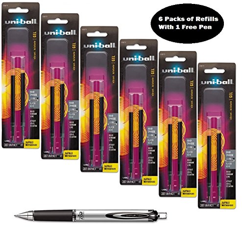 Deal includes: 6 packs 65873 UniBall Signo Impact 207 Black gel ink 1.0 mm refills (12 Refills Total) plus 1 Free 65870 Black Gel Ink Pen