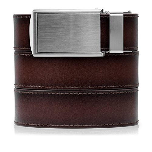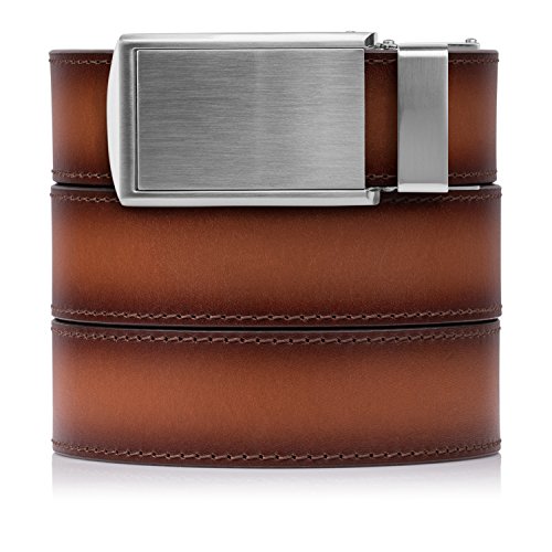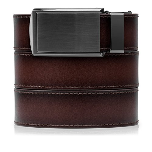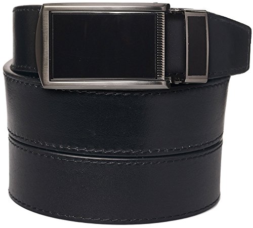 What is a SlideBelts brand ratchet belt? It's a leather belt that lets you freely adjust your belt size without the limitation of holes in the leather. In fact, there are no holes at all! A tab in the buckle catches on a row of notches sewn onto the underside of the leather, allowing for over 30 size options with 1/4" (6.35 mm) between adjustments. All SlideBelts come with a belt strap that can be trimmed to your exact waist size. The full length of one of our straps fits up to a 48" (122 cm) waist size. All buckles are completely removable and interchangeable with compatible SlideBelts products. Try SlideBelts out and see why there's no reason to poke holes in a perfectly good piece of leather.Feature