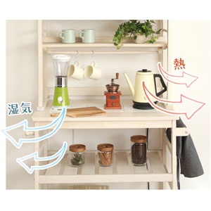 背面やサイドがオープンなので通気性がよく熱や湿気がこもりにくいです。家電などのコードを通しやすいので配線も楽ラク!