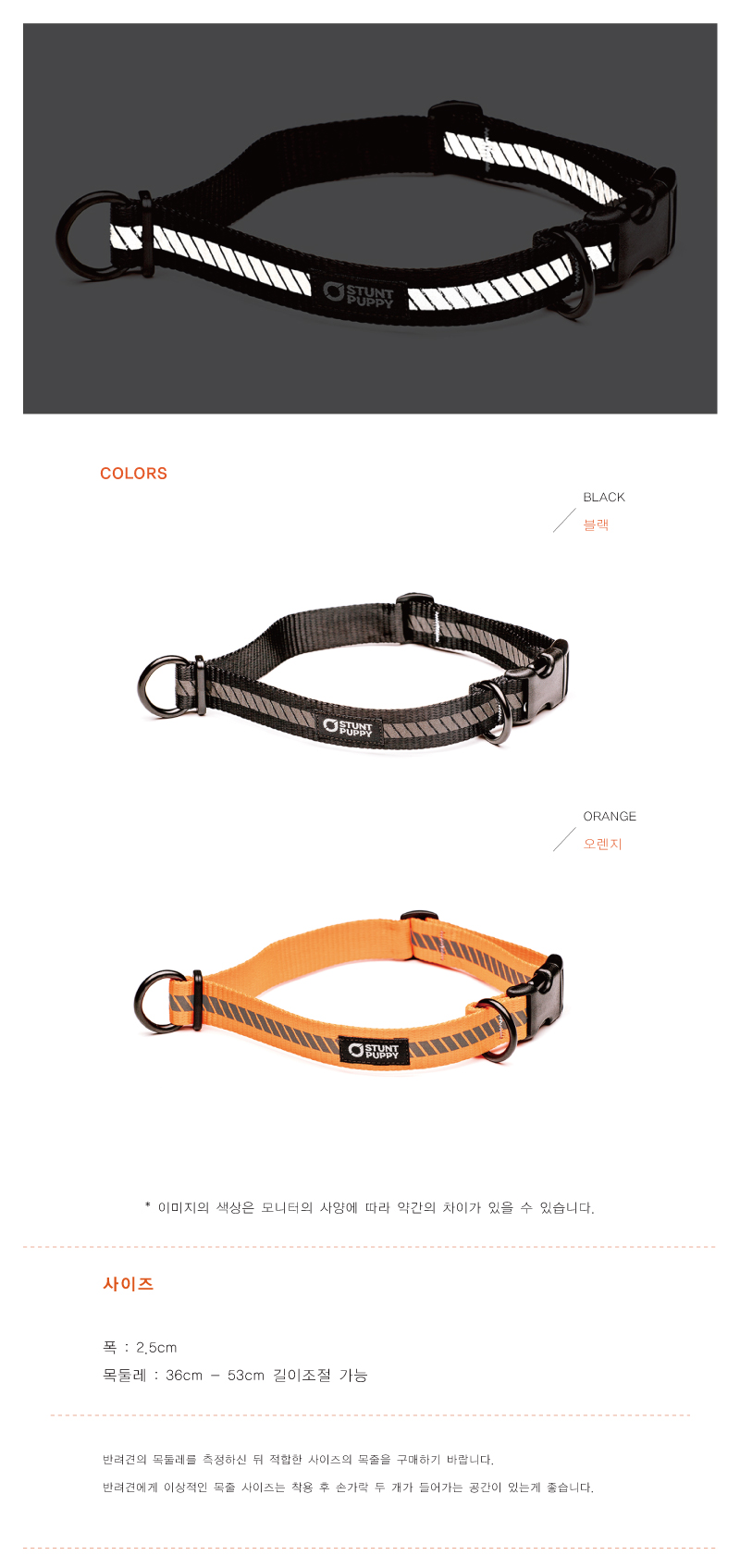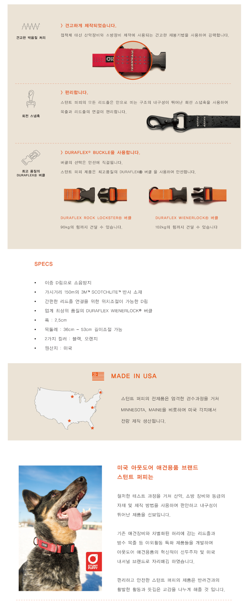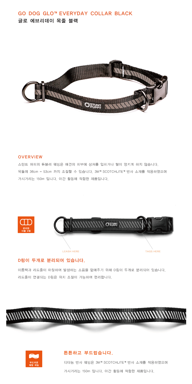 애견목줄은 부드럽고 편안해야 합니다. 스턴트 퍼피의 튜블러 웨빙은 애견의 피부에 상처를 입히거나 털이 엉키게 하지 않습니다. 목둘레 36cm -53cm 까지 조절할 수 있습니다. 3M™ Scotchlite™ 반사 소재를 사용하여 가시거리 150m까지 반사가 되어 야간 활동에 적합한 제품 입니다.