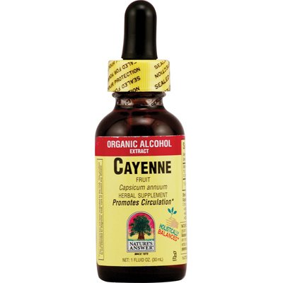 Nature's Answer organic alcohol extracts are produced using alcohol, water and coconut glycerin utilizing our cold Bio-Chelated proprietary extraction process, yielding a Holistically Balanced standardized extract. Liquid extracts are absorbed faster than tablets or capsules and are more potent than tinctures. Holistically Balanced guarantees that the constituents of the extract are in the same synergistic ratios as in the plant. Disclaimer These statements have not been evaluated by the FDA. These products are not intended to diagnose, treat, cure, or prevent any disease.(Note: This Product Description Is Informational Only. Always Check The Actual Product Label In Your Possession For The Most Accurate Ingredient Information Before Use. For Any Health Or Dietary Related Matter Always Consult Your Doctor Before Use.) Ingredients: Nature's Answer Cayenne Fruit Directions Shake well. As a dietary supplement take 1/4-1 mL (approx. 7-28 drops) 3 times a day in a small amount of water. Supplement Facts Serving Size: 1 mL (Approx 28 Drops) Servings Per Container: 30 | Amt Per Serving | % Daily Value | | Cayenne Fruit Extract (1:5) Equivalent to 200 mg Cayenne Fruit. Guaranteed to contain a minimum of 10,000 scoville heating units. | 1000 mg | * | | *Daily value not established. Other Ingredients: 80-92% certified organic alcohol and purified water. Warnings Do not use if pregnant or nursing. 083000001819 Pack Of: 1 0 |