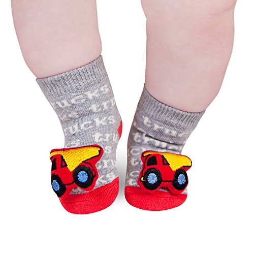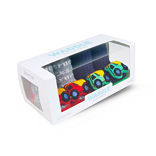 Package includes 2 pairs of Waddle and Friends high-end designer rattle toe baby socks. Boutique newborn booties are adorable developmental foot finder toys that help develop sensory processing skills and provide entertainment. Unisex newborn baby rattle sock baby booties are both cute and functional. Baby socks have an adorable lightweight soft rattle on the front to aid In developing eye hand coordination. Baby booties help keep babies entertained and encourage playful body discovery.