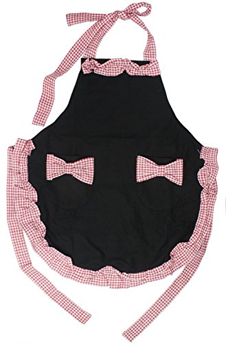 OOOUSE Lovely princess rural style Cotton Grid Pattern Working Chefs Kitchen Cooking Cook Womens Ladies Fancy Maid Set Apron with Bowknots Pockets Design Great Gift For Wife Daughters Ladies (Black with Red)