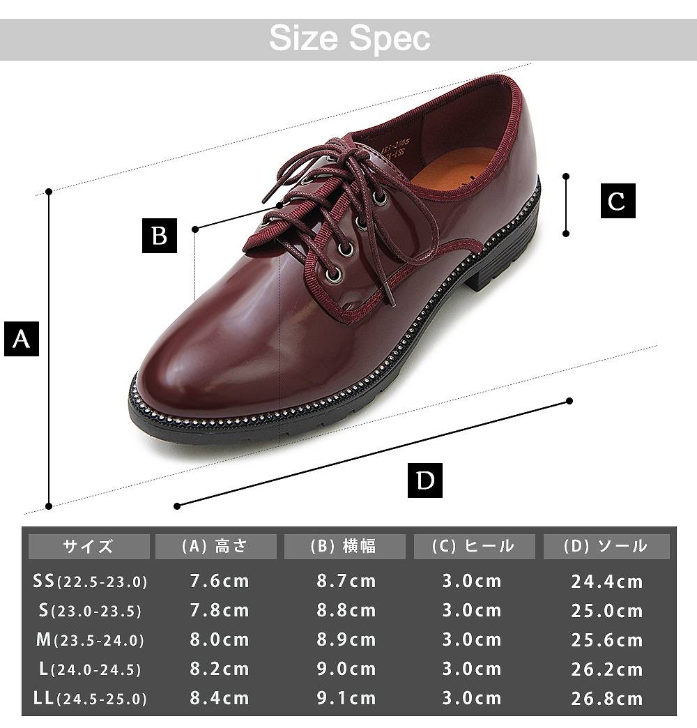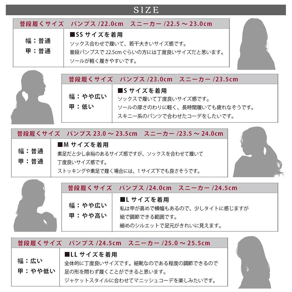 | サイズ(約:cm) | SS(22.5cm-23.0cm) S (23.0cm-23.5cm) M (23.5cm-24.0cm) L (24.0cm-24.5cm) LL(24.5cm-25.0cm) |