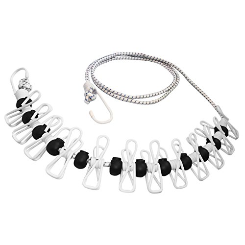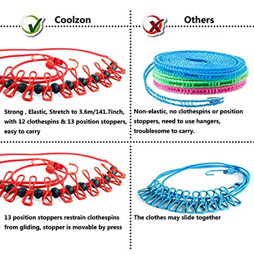 Coolzon Portable Travel Clothesline Windproof Elastic Clothes Lines Retractable Laundry Line Adjustable Rope with 12pcs Anti-Skid Clothespins 13pcs Position Stoppers for Outdoor and Indoor (White)