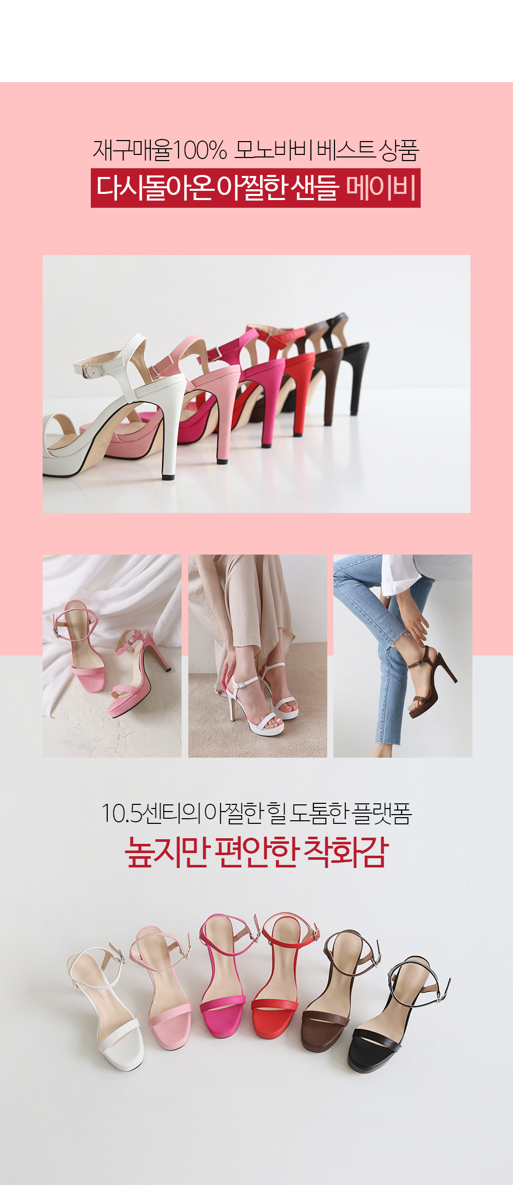 10.5센티의 아찔한 힐과 도톰한 플랫폼은 제법 높이감이 있음에도 장시간 편안한 착화감입니다 스타일링의 장르를 넘나들어 TPO를 소화하는 힐. 활용도 높은 기본 컬러부터 톡톡튀는 매력적인 포인트 컬러까지 다양하게 구성되었습니다