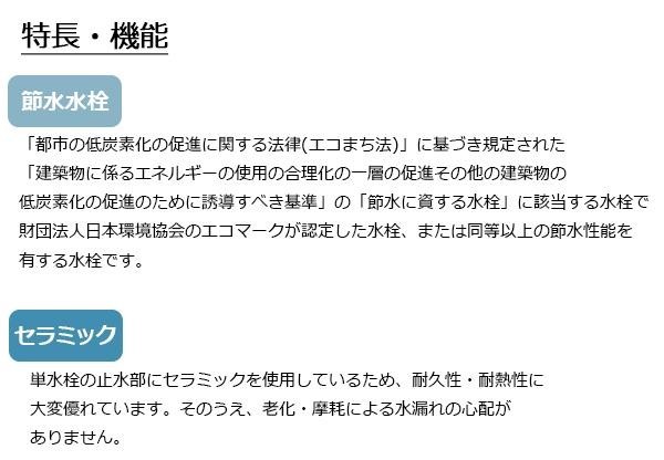 水ハネが少ない泡沫吐水タイプ、定流量機能付(5L/min)の立水栓です。止水部には耐久性・耐熱性に優れたセラミックを使用しています。