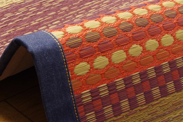広島県福山市のデニム生地メーカー、カイハラ(株)の生地をヘリで使いました。イ草生地は袋織りという技法で繊細な柄を出しています。折れ曲がりが複雑なので長いイ草を使用しないと切れてしまいます。縦糸が密なので、しっかりとして破れにくいのが特徴です。国産(九州産)のい草を使用しています。一本一本が太く、表皮が厚く繊維がキメ細かいので弾力性があり、耐久性に優れています。い草には空気の自然浄化作用、湿度の調節作用などがあります。い草に青森ヒバ加工を施しています。(抗菌、防臭効果)