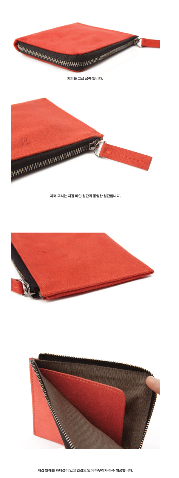 | 누구에게나 어울리는 베이직한 지갑입니다. 장식을 최소화해서 남녀노소 구분 없이 사용 할 수 있습니다. 카드와 현금(반 접어서) 그리고 동전이 넉넉히 들어갑니다. 보통 이런 지갑은 카드와 현금, 쿠폰등이 안에서 섞여 불편하셨지요? 저희는 안에 튼튼한 파티션을 넣어 카드와 쿠폰/현금이 분리 수납 가능합니다. 소재는 스웨이드 느낌의 부드러운 감촉이 좋은 합성피혁입니다. 이 지갑은 빳빳하여 내용물이 구겨질 염려가 없습니다. 안감도 고급 면으로 신경써서 제작했습니다. |