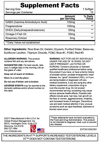 Studio : Global Product Management Publisher : Global Product Management Binding : Health and Beauty Product Description Build Muscle, Increase Strength, Feel Younger and get in the Best Shape of your life. Let HT Higher Testosterone help. One Softgel a day is all it takes to roll back the clock and regain the strength, feeling and vitality you thought was only a thing of the past. Testosterone regulates many of the body's functions. It influences libido, energy, bone and muscle development and the regulation of fat, sugar and blood pressure. Lower testosterone levels have been linked to depression, fatigue, decreased libido, weight gain, nervousness, impaired memory, insomnia, hot flashes, and sweating. Testosterone production naturally declines with age. After the age of 25, testosterone levels in men begin to decline at an average of 1.25% per year. This decrease in testosterone production is a growing concern for men, especially over 40 years old who are feeling the effects of old age and not being able to perform or feel like they used to. DHEA and Pregnenolone are "parent" hormones of the sex hormones estrogen, progesterone, and testosterone. Taking pregnenolone or DHEA supplements, therefore, may indeed raise levels of those sex hormones. 0