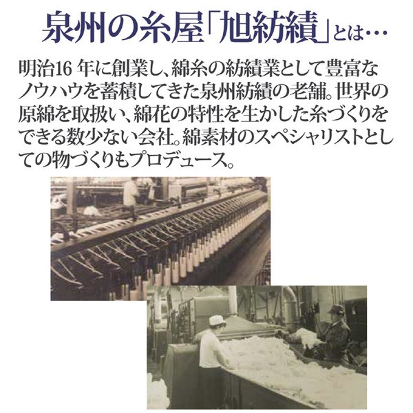 泉州の糸屋「旭紡績」・・・明治16年に創業し、綿糸の紡績業として豊富なノウハウを蓄積してきた泉州紡績の老舗。世界の原綿を取扱い、綿花の特性を生かした糸づくりをできる数少ない会社。綿素材のスペシャリストとしての物づくりもプロデュース。